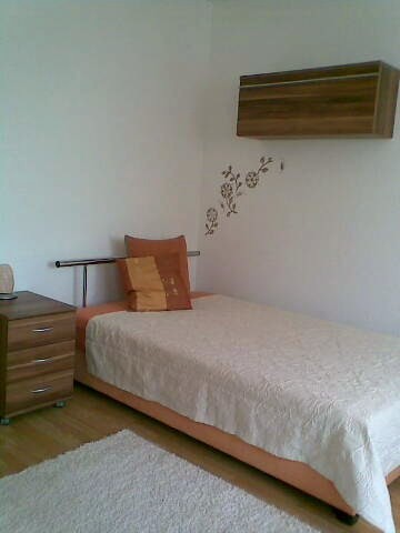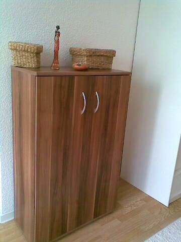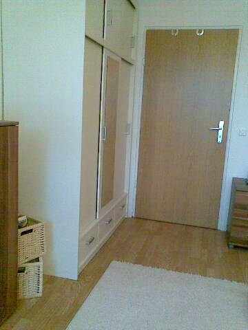 7.497Vorher stand der große kieferfarbene Kleiderschrank da, wo jetzt meine schöne und vor allem bequeme Schlafcouch steht - mein "Prinzessinnenbett"! An der kurzen Wand ist ein neuer weißer Schiebetüren-kleiderschrank, der nicht aufträgt, aber viel Stauraum hat, daneben eine Kommode Nussbaumfarben und ein heller einfarbiger Hochfloorteppich bringt etwas Gemütlichkeit. Ein kleiner nussbaumfarbener Rollcontainer dient u.a. als Nachttisch. Auf dem Polsterbett mit Tagesdecke kann man auch prima sitzen und chillen oder Fernsehen (sofern ich demnächst sowas habe). Vor dem Polsterbett an der langen Wand steht jetzt eine kleine neue Kommode in nussbaumfarben und danach kommt der Schreibtisch.mit der Fensterfront davor.