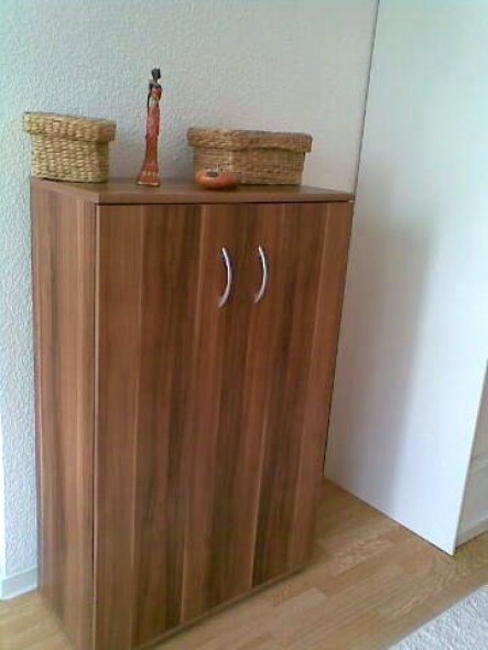 7.381Vorher stand der große kieferfarbene Kleiderschrank da, wo jetzt meine schöne und vor allem bequeme Schlafcouch steht - mein "Prinzessinnenbett"! An der kurzen Wand ist ein neuer weißer Schiebetüren-kleiderschrank, der nicht aufträgt, aber viel Stauraum hat, daneben eine Kommode Nussbaumfarben und ein heller einfarbiger Hochfloorteppich bringt etwas Gemütlichkeit. Ein kleiner nussbaumfarbener Rollcontainer dient u.a. als Nachttisch. Auf dem Polsterbett mit Tagesdecke kann man auch prima sitzen und chillen oder Fernsehen (sofern ich demnächst sowas habe). Vor dem Polsterbett an der langen Wand steht jetzt eine kleine neue Kommode in nussbaumfarben und danach kommt der Schreibtisch.mit der Fensterfront davor.