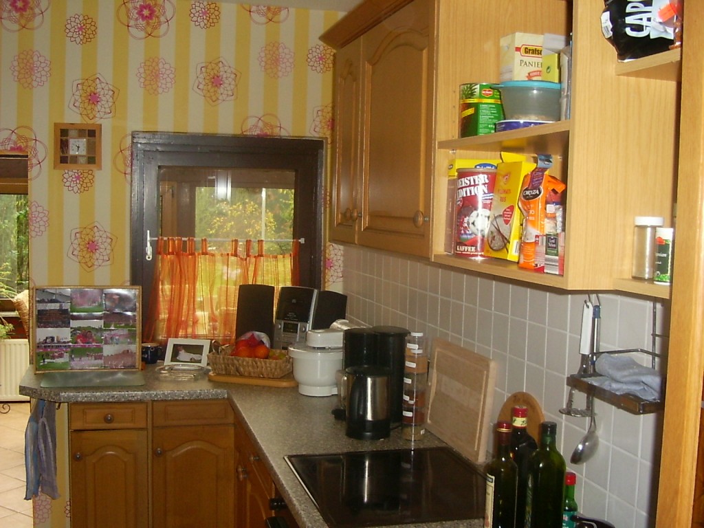 Ansich mag ich den Raum, der nicht so groß oder breit ist, mit Blick Richtung Wintergarten/Garten. Auch die von den Vorbesitzern erst vor kurzem neu angebrachte Tapete von Esprit mag ich total gerne. ABER: Die Küche ansich passt meiner Meinung nach so gar nicht zu der modernen Tapete. Die Küche entspricht auch nicht wirklich meinem Geschmack. Ich mag da lieber das moderne. Hatte ich vorher in der Mietswohnung auch.