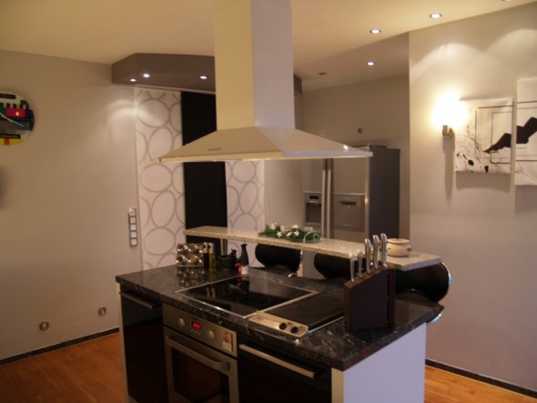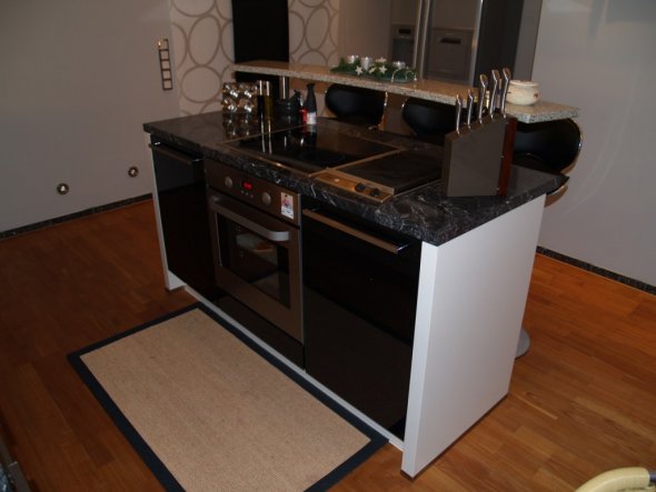 14.504Unsere Küche... Der Boden ist ein geölter Kirschholzparkett. Die Küche hat eine doppelflüglige Balkontür, durch die man direkt in den uneinsehbaren Vorgarten gelangt. Die Nischenverkleidung ist selbstgemacht und besteht aus einer Holzrahmenkonstruktion die mit Black-Galaxy Granit belegt wurde, im Grunde wirkt es wie ein Bilderrahmen. In der Mitte der Nischenverkleidung befindet sich ein kleiner LCD TV dieser wurde hinter der Glasscheibe montiert. Das hochglanz Schwarz der Küche ist mit kleinen Goldglittern durchzogen. Stolz bin ich auf meinen Miele Grill der sich ebenfalls in der Kochinsel befindet und auf die kleine Weinecke :-)