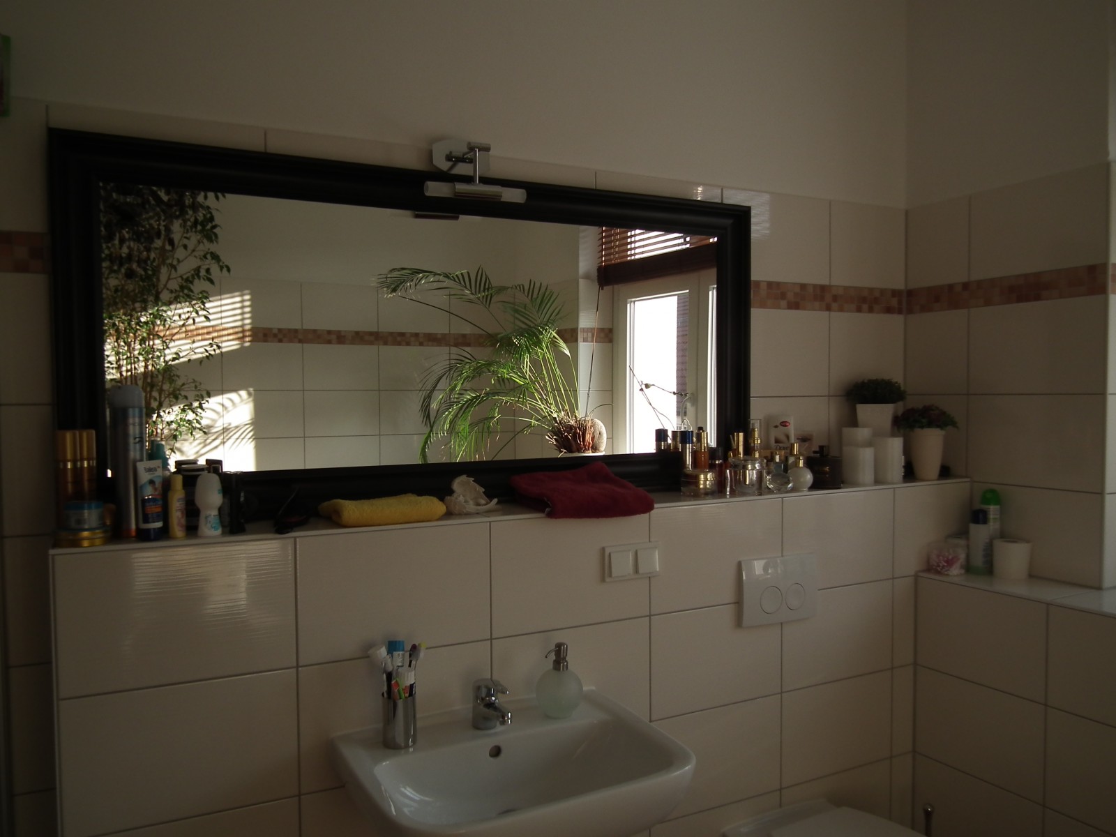 Das ist unser Bad was ca 9,5m² groß ist,hier sind wir auch noch nicht ganz fertig.Vielleicht noch ein wenig Farbe,beige,über dem Fliesenspiegel?