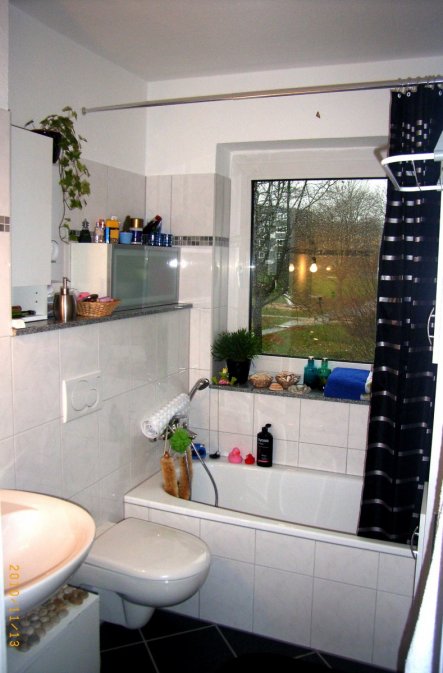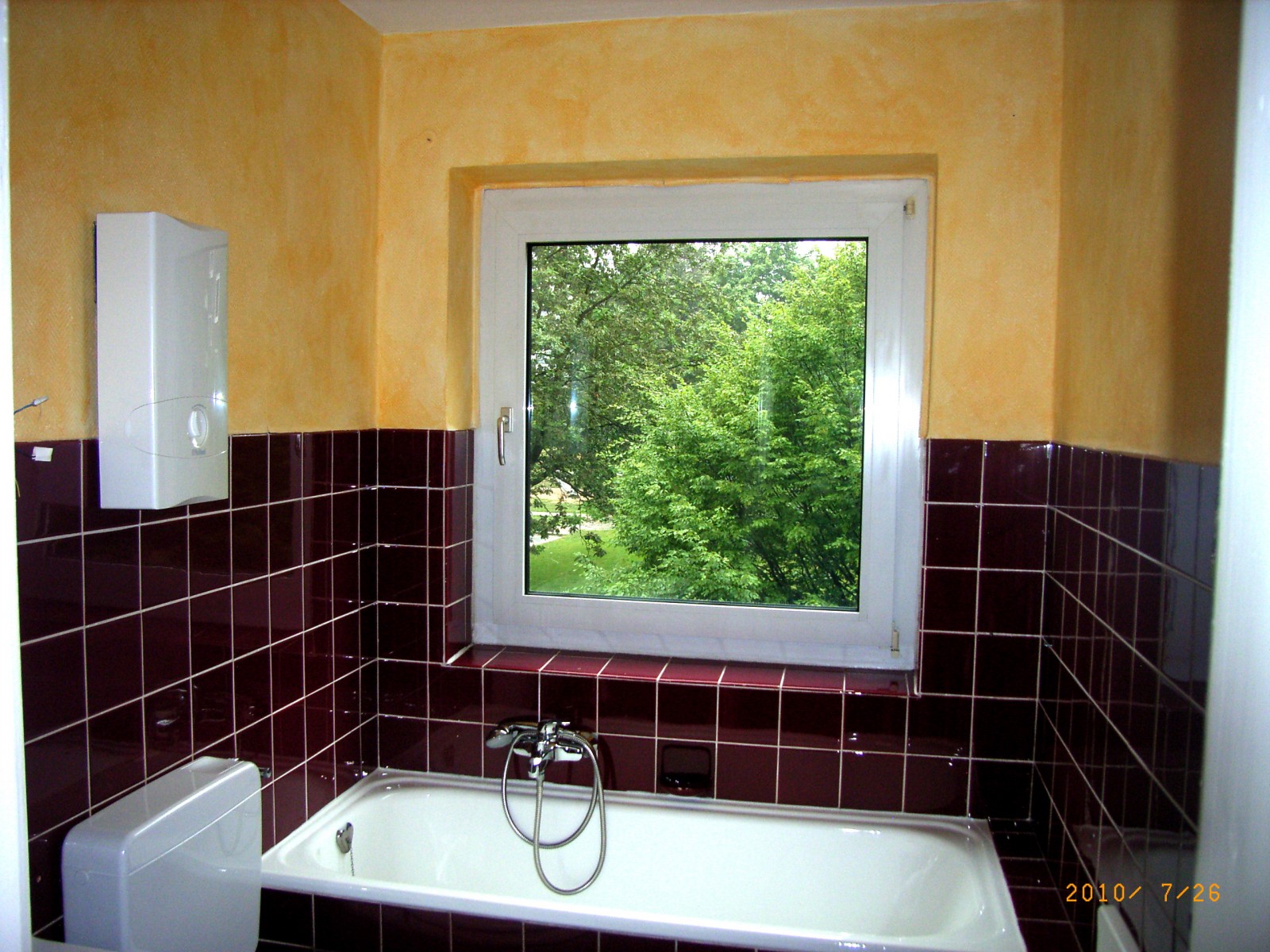 8.267Vorher und Nachher-Bilder. Das Bad (ca. 3 qm, also recht übersichtlich)wurde vor Einzug 09/2010 glücklicherweise noch einer Schönheitskur durch den Vermieter unterzogen. Die dunkelroten Fliesen und orangen Wände wurden gegen weiße, leicht strukturierte Fliesen mit einer braun/grauen Mosaikbordüre, einen dunkelgrauen Fußboden mit leichtem Glitzereffekt und weiße Wände eingetauscht. Die normale Heizung wurde durch eine große Handtuchheizung ausgetauscht. Das Stand-WC wurde gegen ein Hänge-WC getauscht.