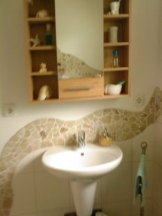 In mühevoller Kleinarbeit haben wir uns das Bad so schön gestaltet. Das Zimmer ist ein ehemaliges Kinderzimmer; aus dem alten sehr kleinen Bad wurde eine Kleiderkammer.