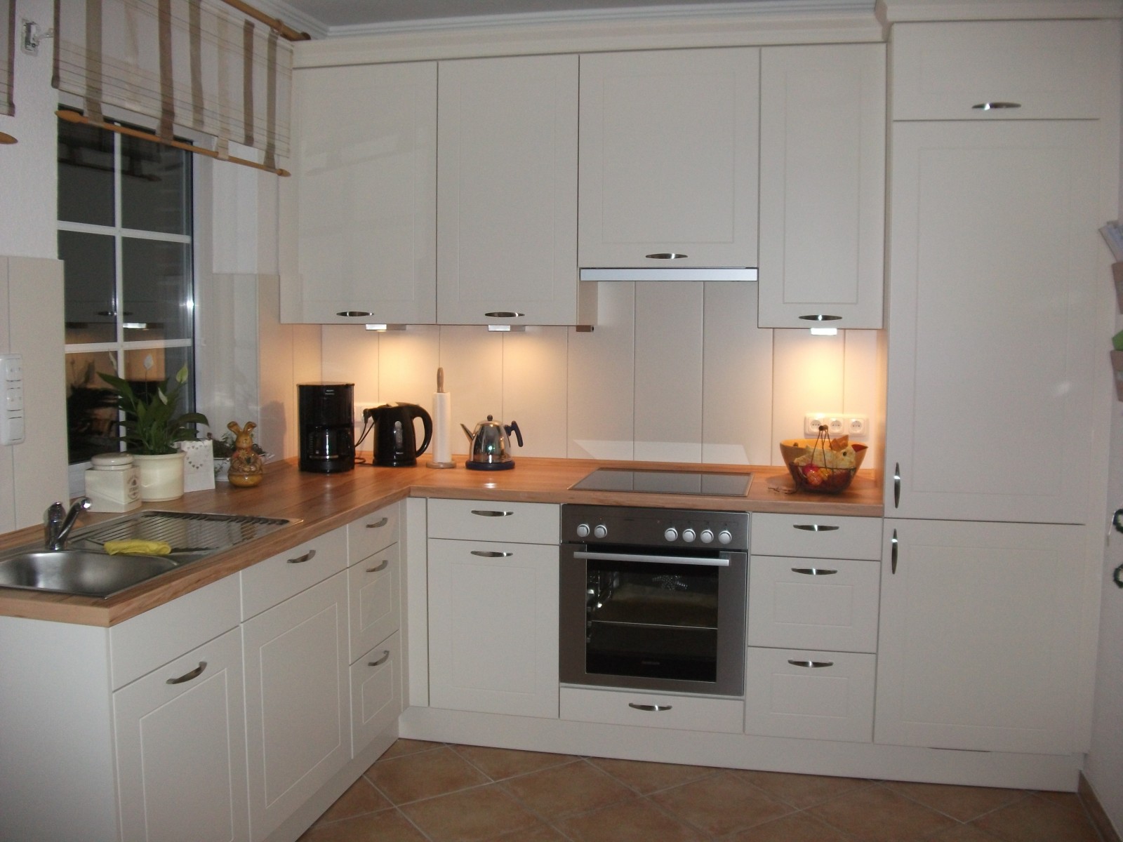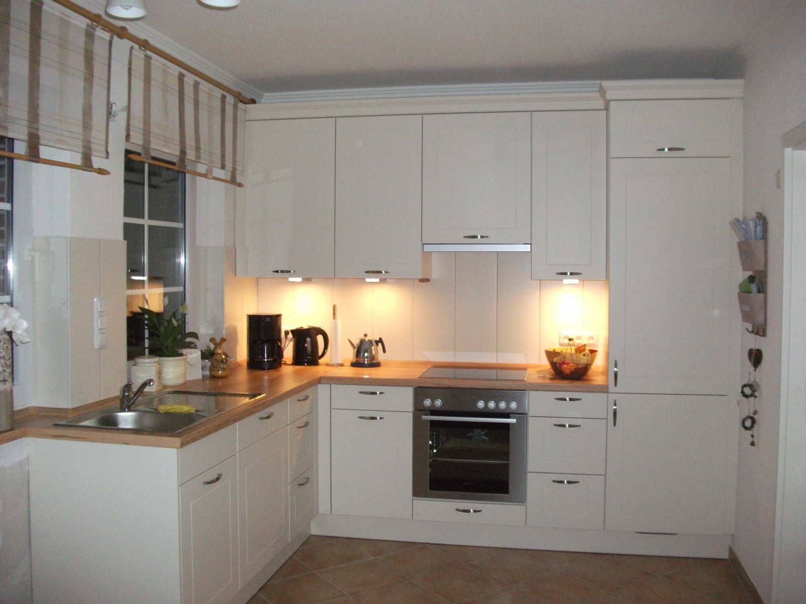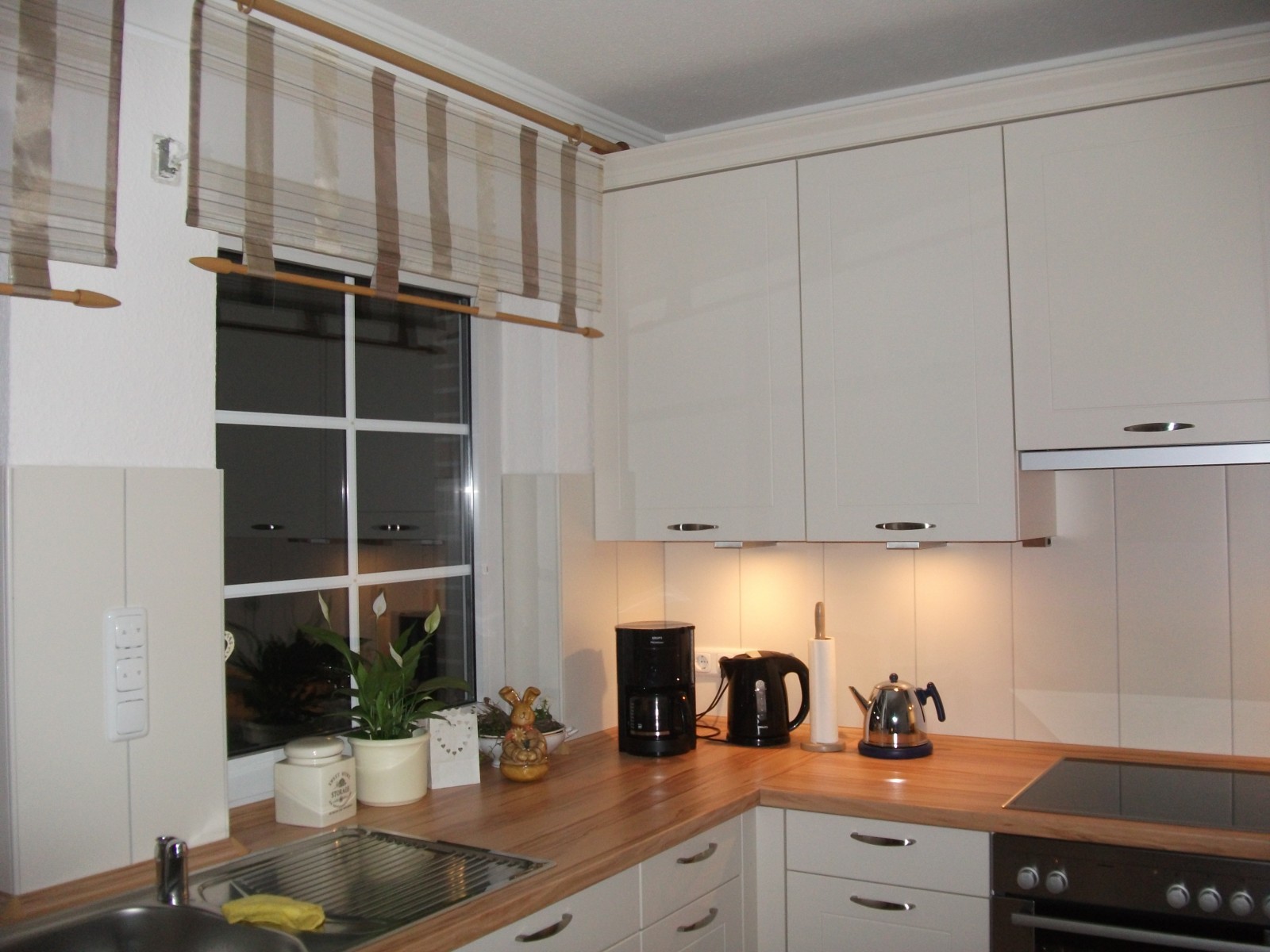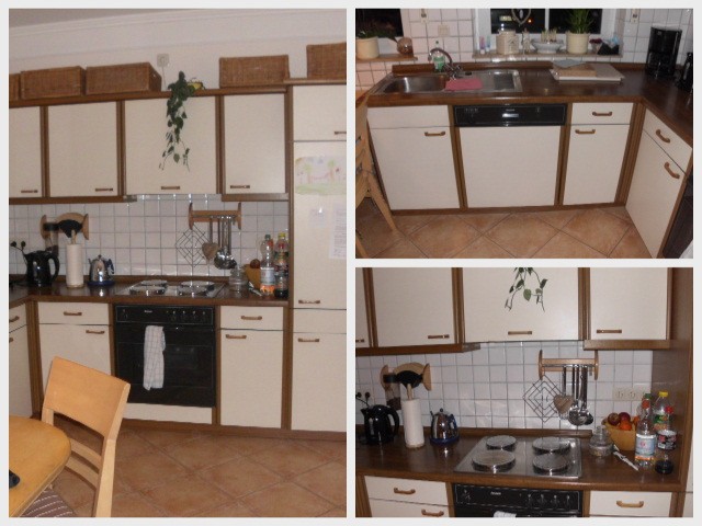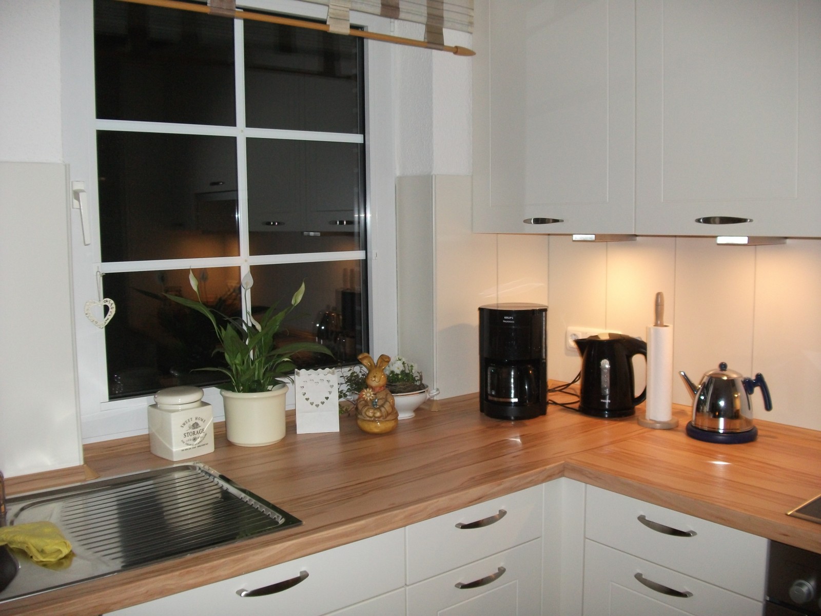 12.823Hallo, nach langem warten ist sie endlich da...meine neue Küche... Die Fronten sind in Magnolie und die Arbeitsplatte ist Kernholz.Die Wände wurden neu gestrichen,der Fliesenspiegel ist neu und es gab neue elektrische Rollos,weil ich die Bänder so schrecklich fand.Die Deko ist erstmal die Alte,bis ich was schönes finde. Es fehlt noch unsere Tischplatte,die wird neu lackiert,damit sie zum Rest paßt,neue Stühle hätte ich auch gerne,am liebsten solche Loomstühle,aber das muß noch warten. Das ganze hat nun fast 14 Tage gedauert,aber für mich hat es sich gelohnt....