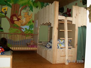 Wir haben das Zimmer zum Thema Pirat gestaltet und die Wand so gestaltet das das Hochbett mit im Gesamtbild integriert ist.