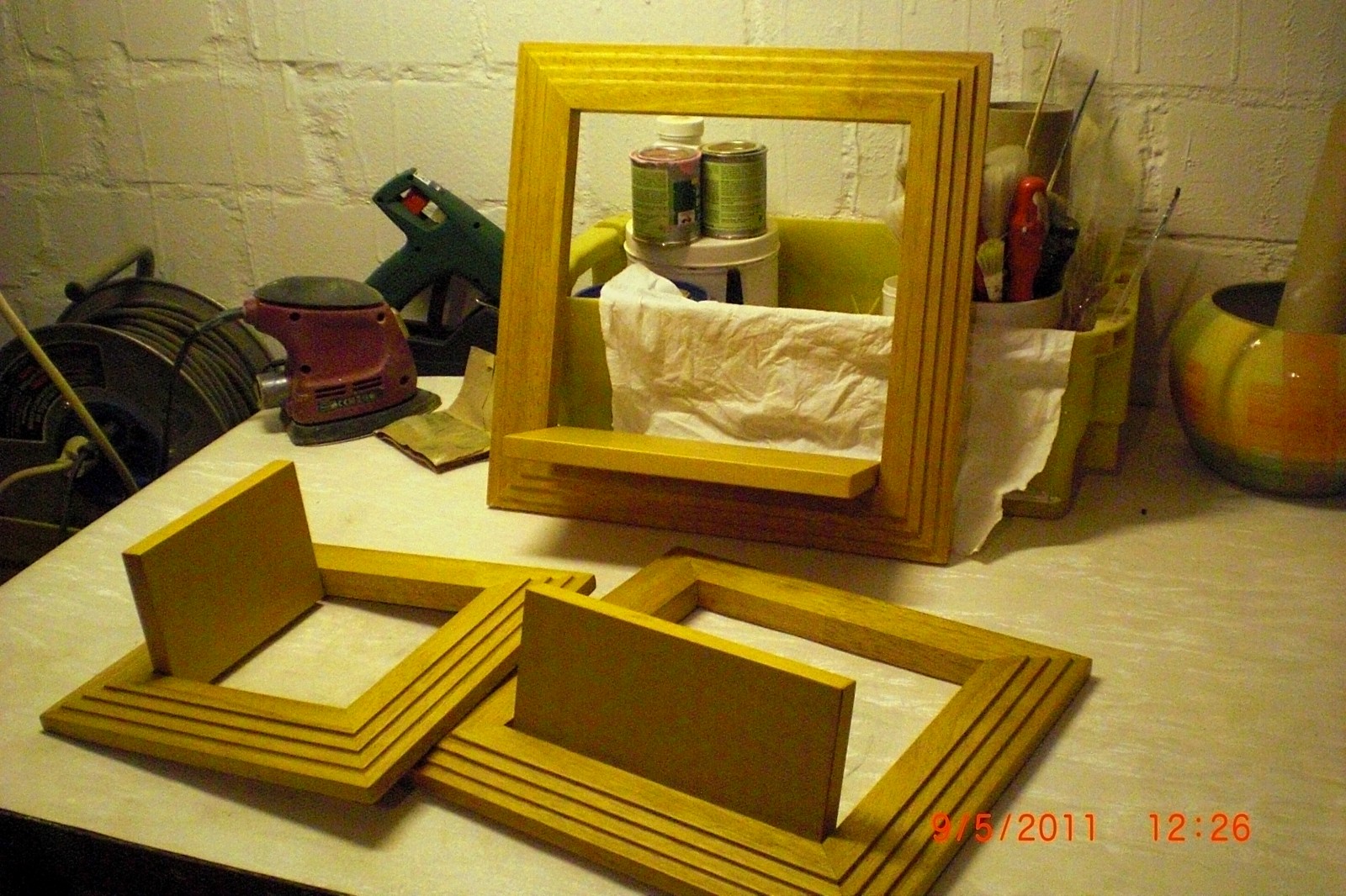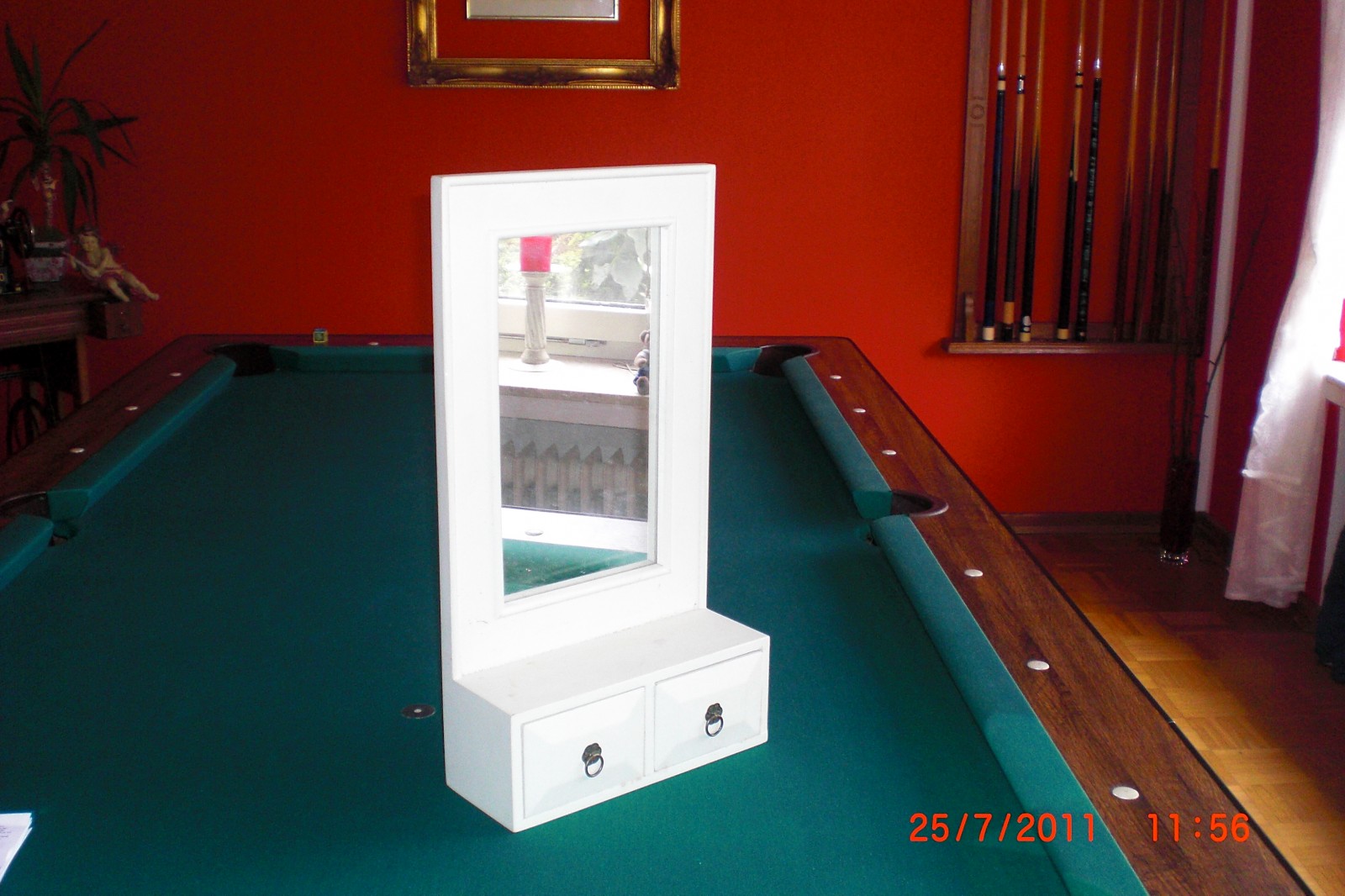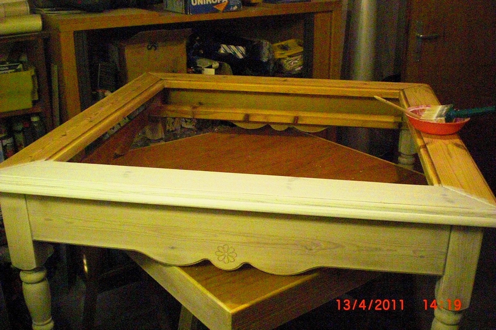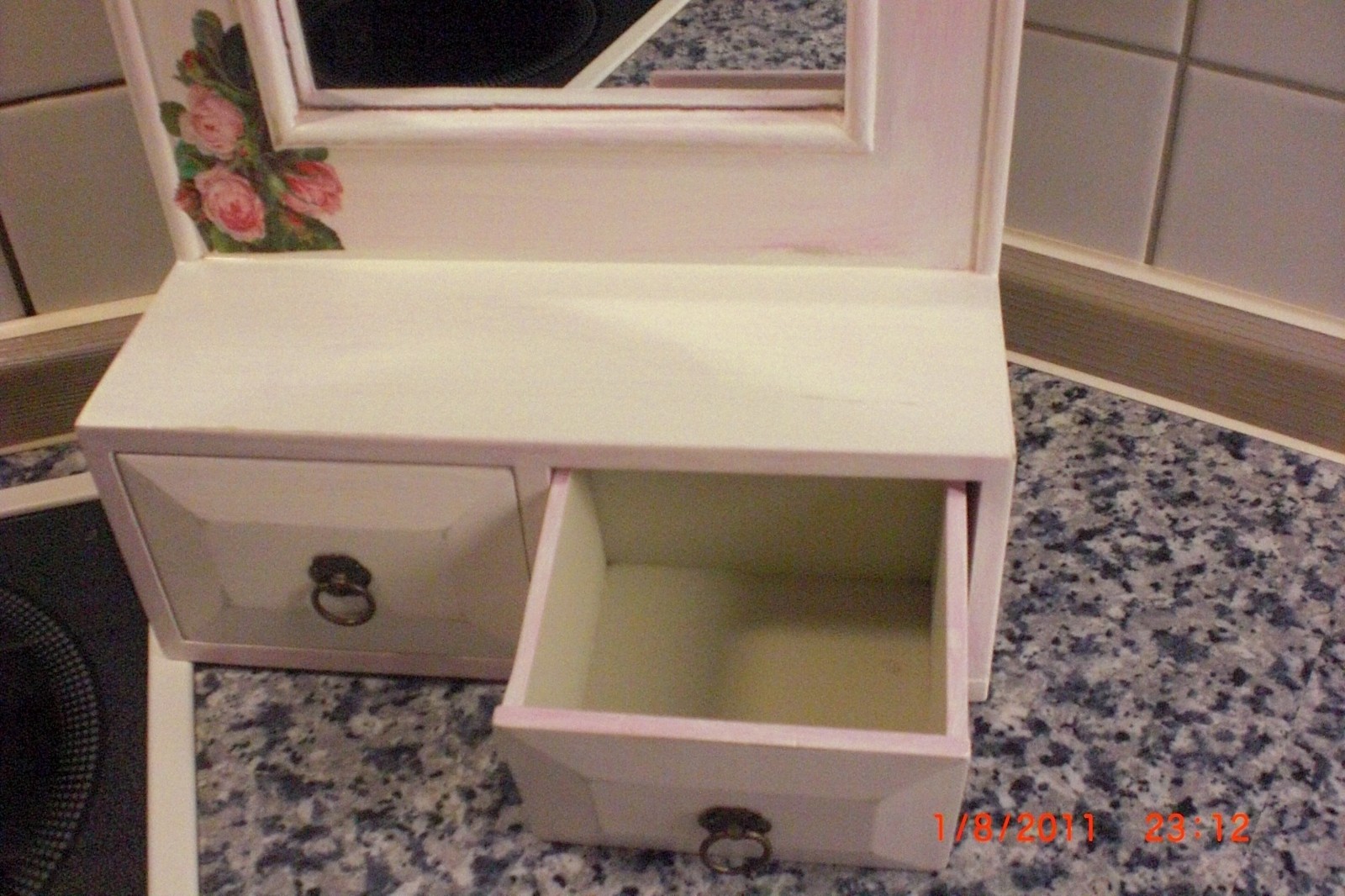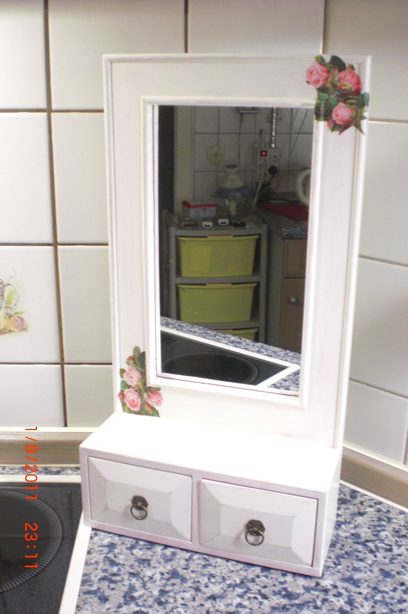 so, es ist der 9.8. und ich hab endlich mein "altes" regal fertig :-) ich suche nur noch den passenden platz dafür ;-) und einen kleinen spiegel hab ich auch noch fertig gemacht.