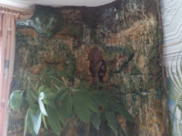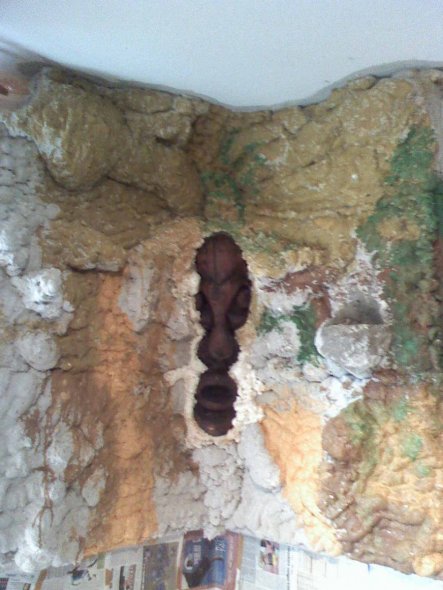 Die Ecke unter dem Stiegenaufgang zur Galerie hinauf, wird mit Styropor-Fliesenkleber und Acrylfarben auf Felswand getrimmt....