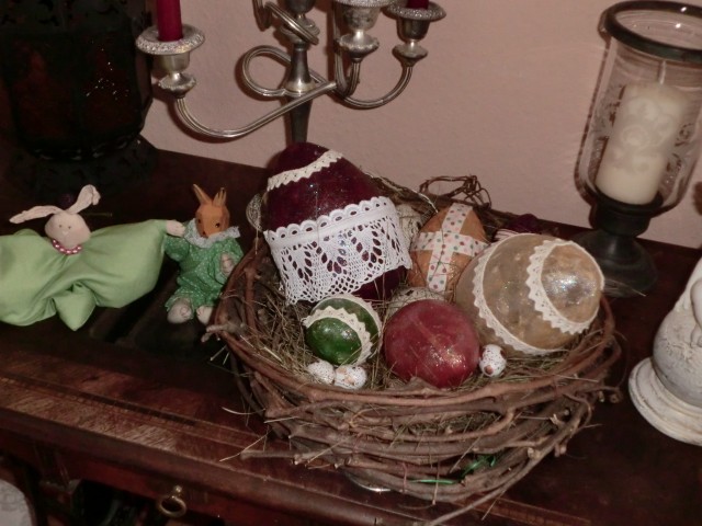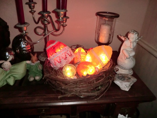 diese Ostereier können leuchten....!Ich habe Kunststoff-Rohlinge mit Servietten und Seidenpapier beklebt, mit Spitze verziert und dann mit der Heißklebepistole ein Loch für die Lichterkette "gebrannt".Ist ganz simpel, aber sehr effektvoll....
