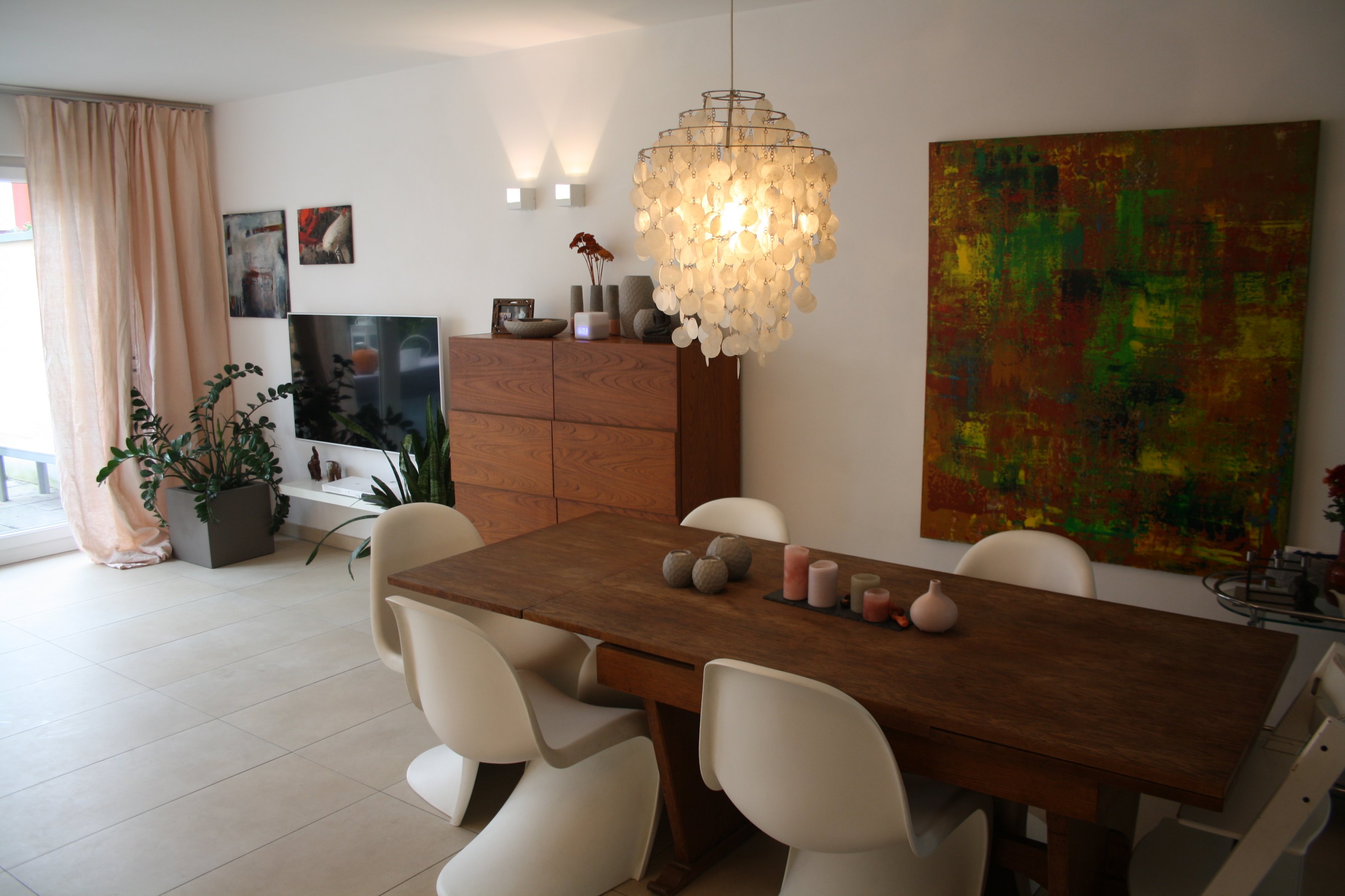 An dem alten Esstisch hat mein Vater als Kind bereits gegessen. Er ist super flott ausziehbar nur leider ist der Abstand zwischen den beiden Wangen nicht gerade breit, so dass nur ein Stuhl in der Mitte drunter passt.
