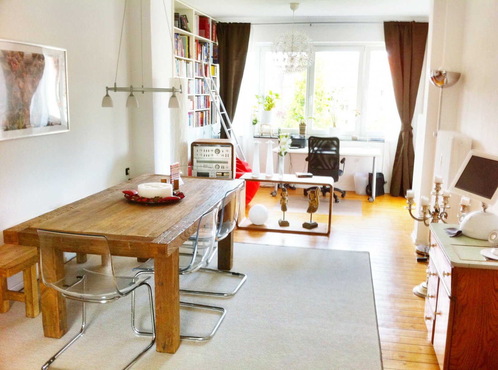 Der erste Versuch von IKEA wegzukommen. Bank und Tisch sind aus Ulme, die Kommode ein Erbstück von Oma. In den nächsten Tagen kommt noch eine Lehne hinzu, um das Sitzen noch gemütlicher zu machen.