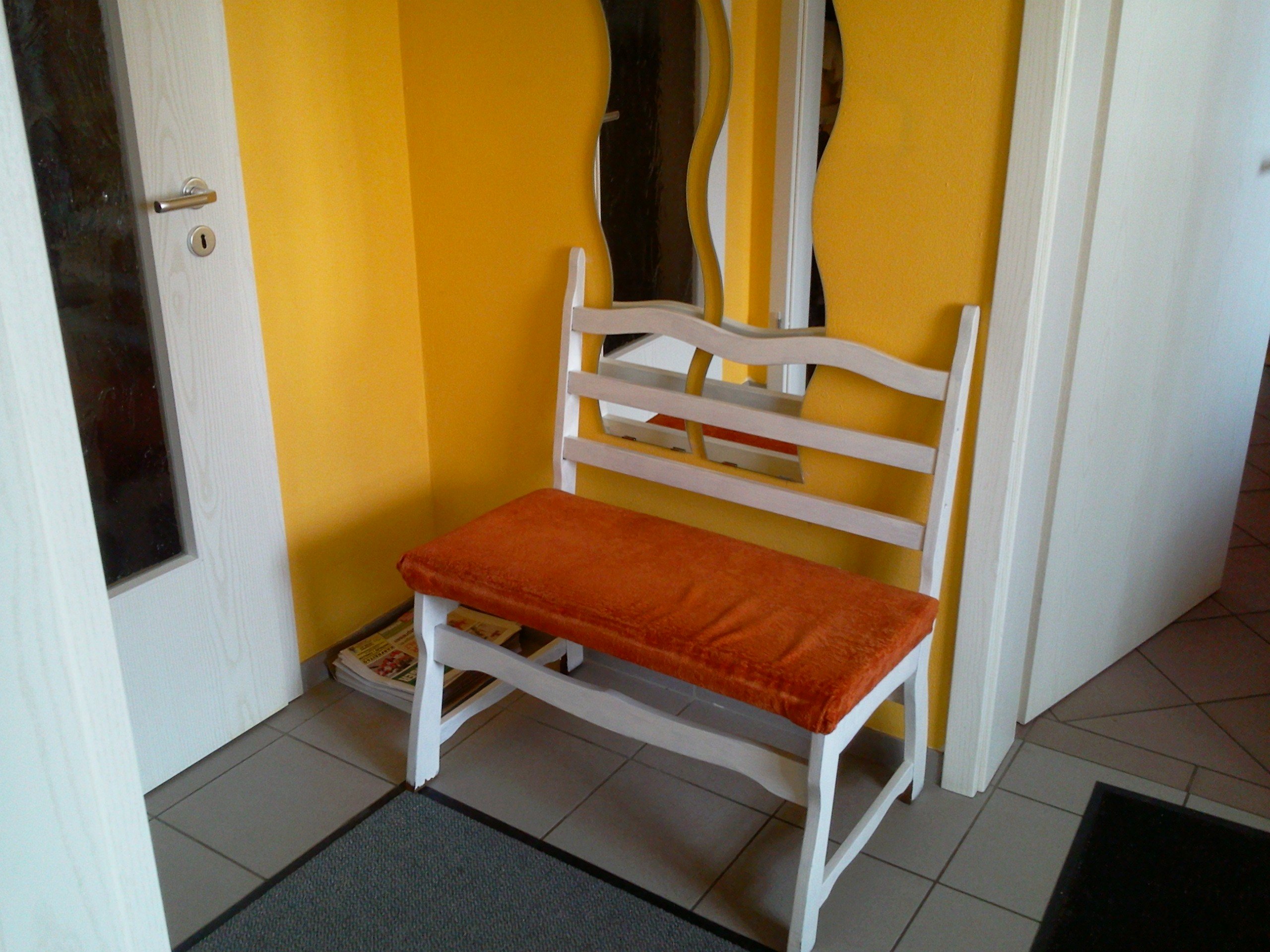 7.696Der Flur wurde in kräftigem Gelb gestrichen und mit einer neuen Sitzbank und Spiegel verschönert.