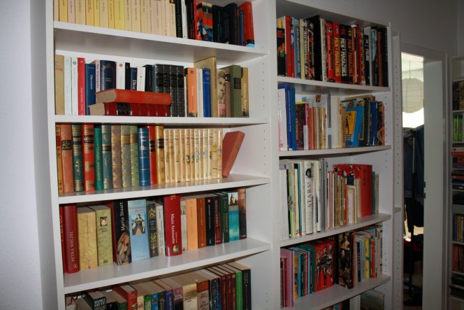 7.027Eigentlich ist unsere Pseudobibliothek nur ein verdammt breiter Flur, aber da wir Cocktailstühle über hatten (hey, immerhin haben die nur 12 € gekostet. Die MUSSTE ich haben!!!) wollen wir uns da eine Sitzecke mit Stehlampe hinbauen. Aktuell haben wir NOCH keine Stehlampe und noch keinen Tisch - aber wir arbeiten dran ;-)