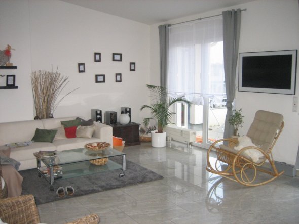 Der Raum ist hauptsächlich mit weißen Sitzmöbeln, Glastische, graubraunen Akazienholzschränken ausgestattet; komplett mit hellen Mamorfliesen ausgestattet, finden sich viele Möglichkeiten mit unterschiedlich farbigen Accessoires zu arbeiten.