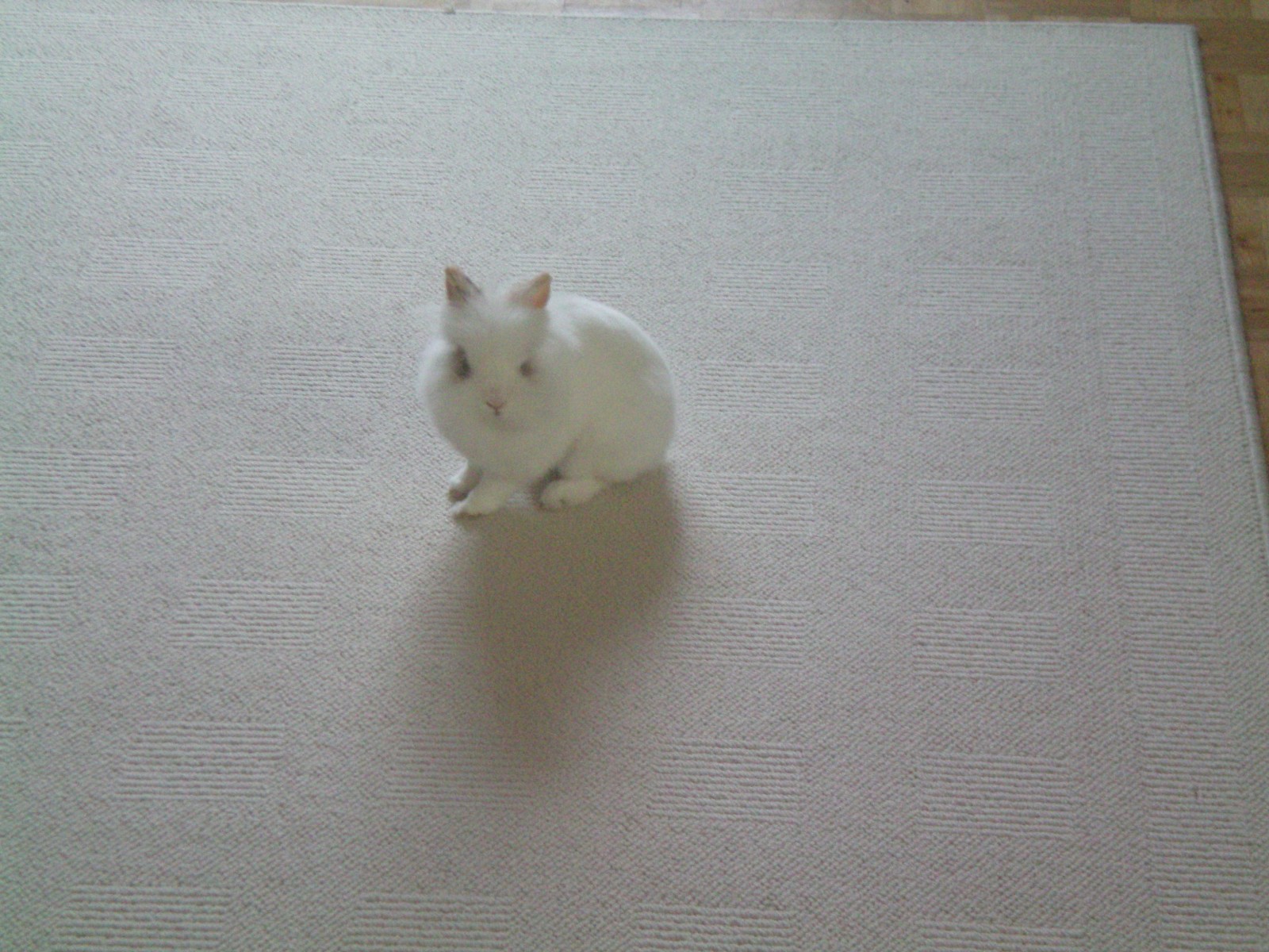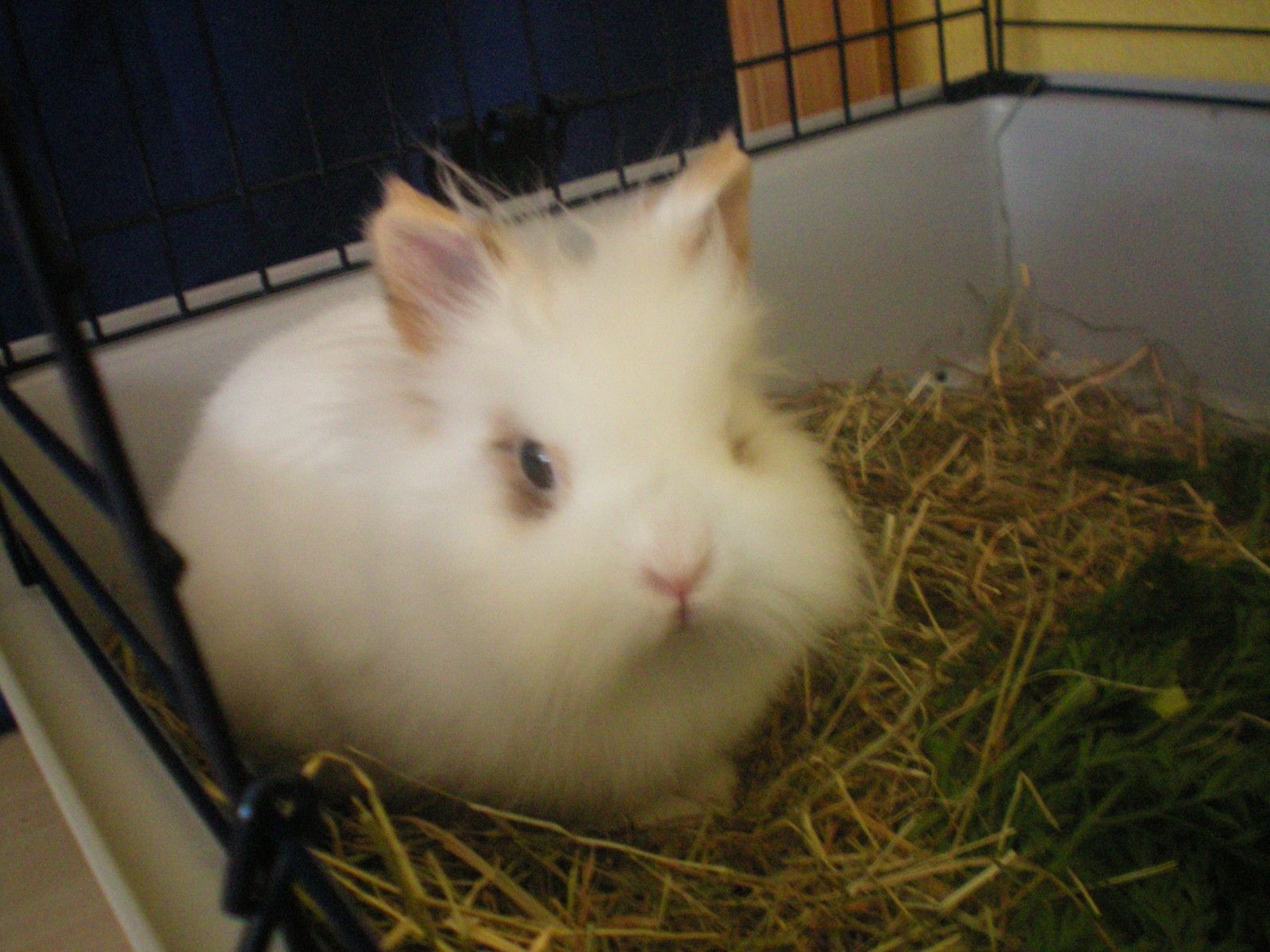 Das ist Flöckchen, unser Knuffel-Kaninchen. Er ist ein Löwenköpfchen.