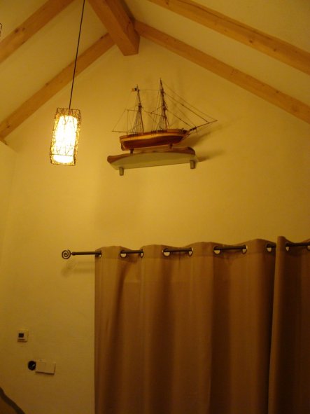 Die Aussparungen im Rigips haben wir direkt beim Ausbau schon gelassen. Es sind je zwei kleine Neonröhren eingebaut, abgedeckt durch auf Plexiglas aufgezogene Sandsteintapete. Gehalten werden die beiden Platten durch Spiegelhalter, so können sie auch mit einem Handgriff bei Bedarf abgenommen werden.