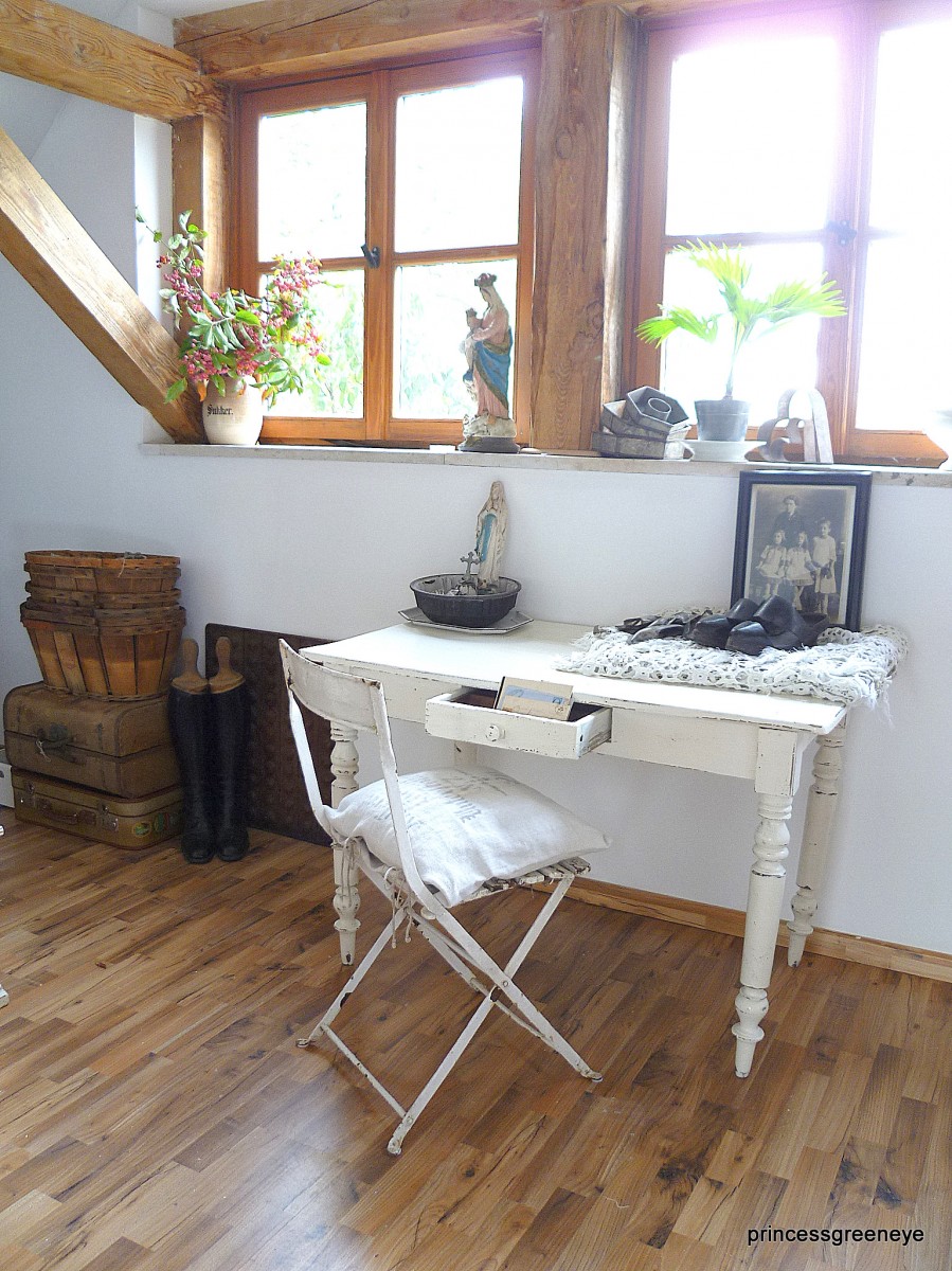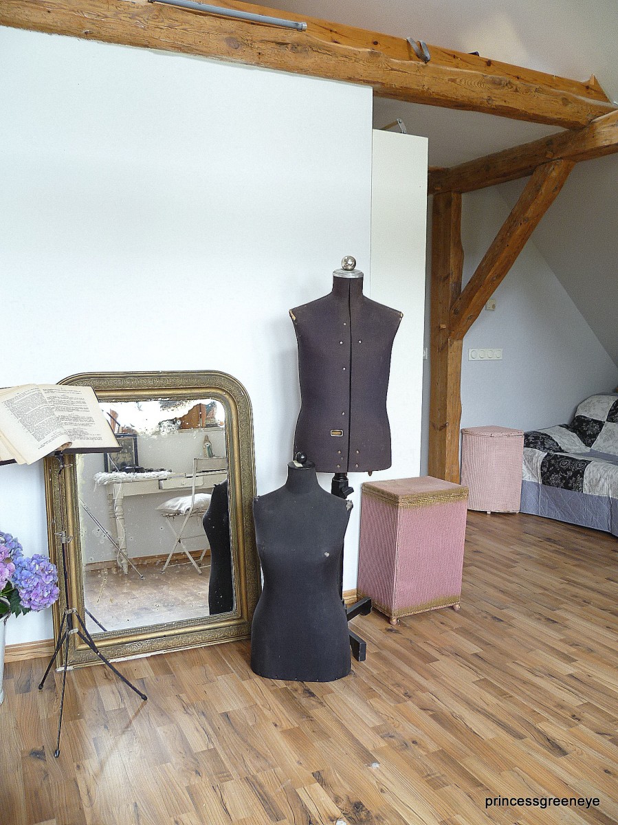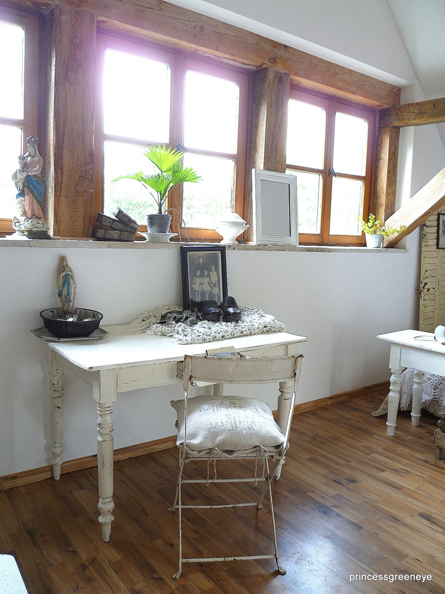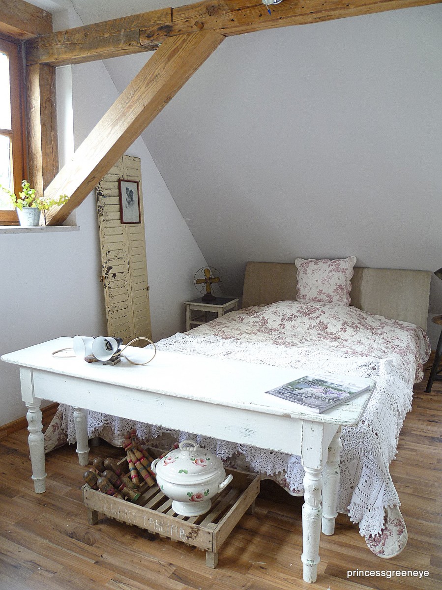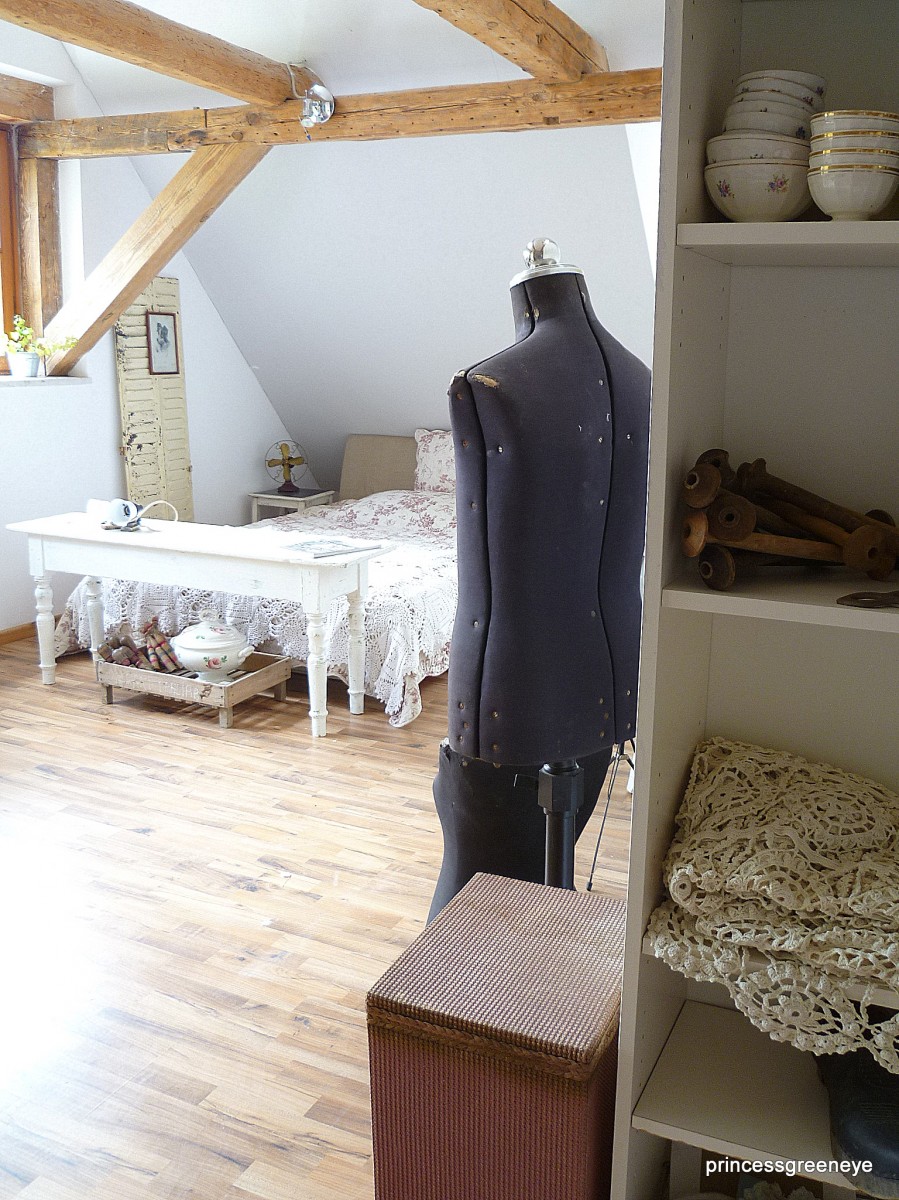 10.065Dieser Raum ist die "2.Hälfte" unseres Dachgeschosses. Bis vor kurzem hat unsere Tochter diesen Raum bewohnt. Nun wurde er komplett neu gestrichen - in warmem Grau und Weiss - und soll nun einerseits ein Gästezimmer sein und wird andererseits als weitere Staufläche für die Teile genutzt, die noch nicht endgültig fertig sind, noch darauf warten in unsere Shops oder unseren Laden zu wandern.