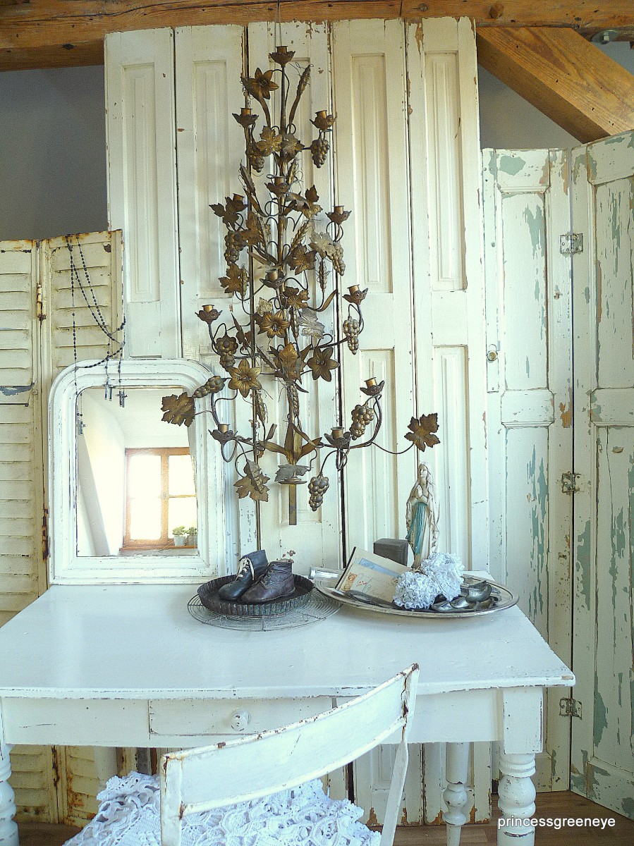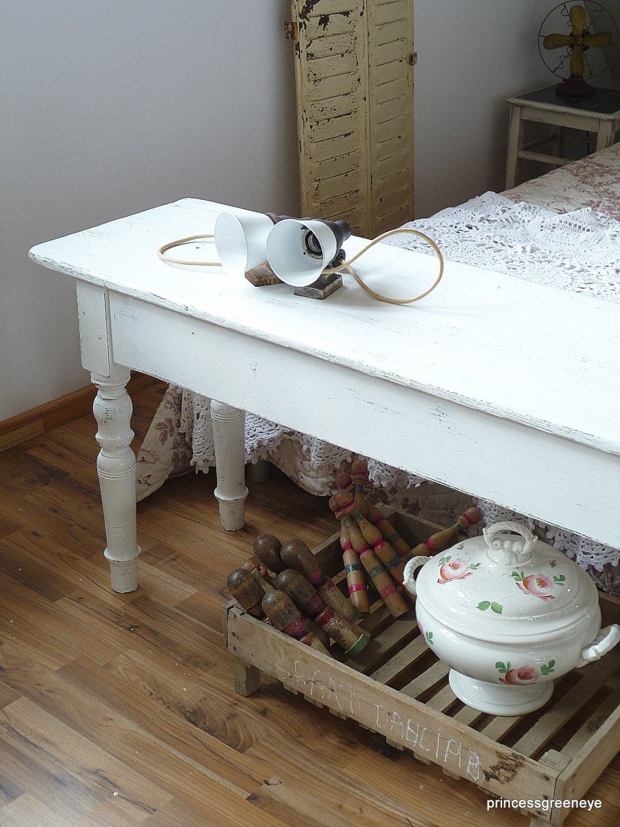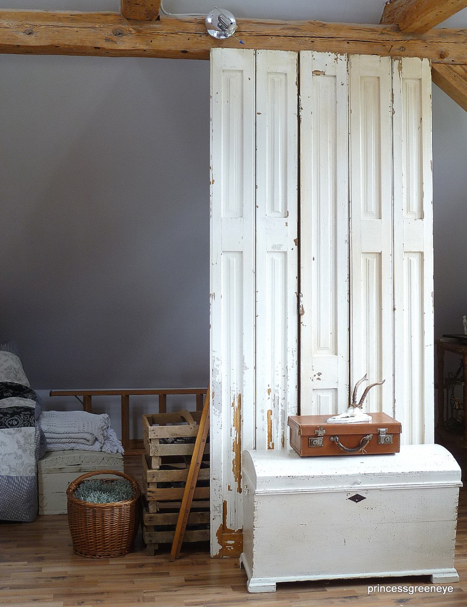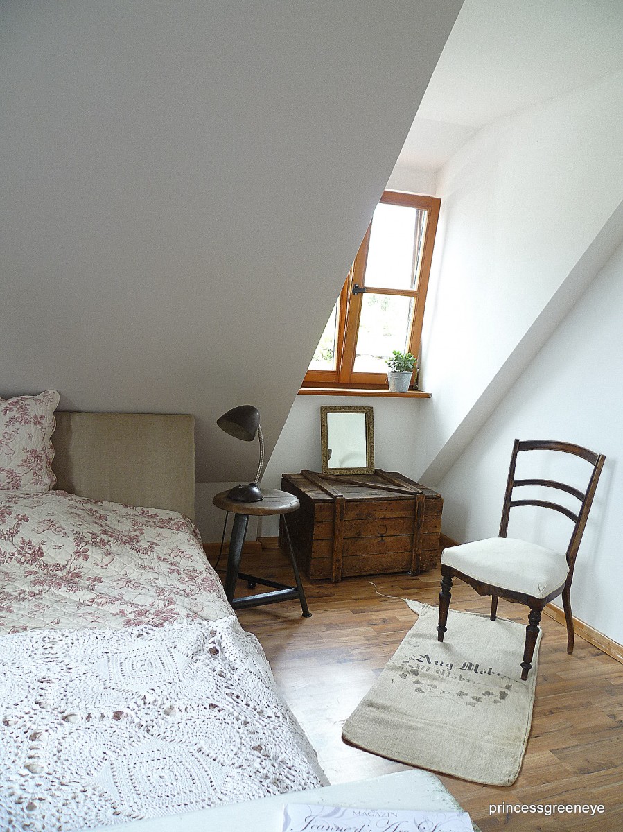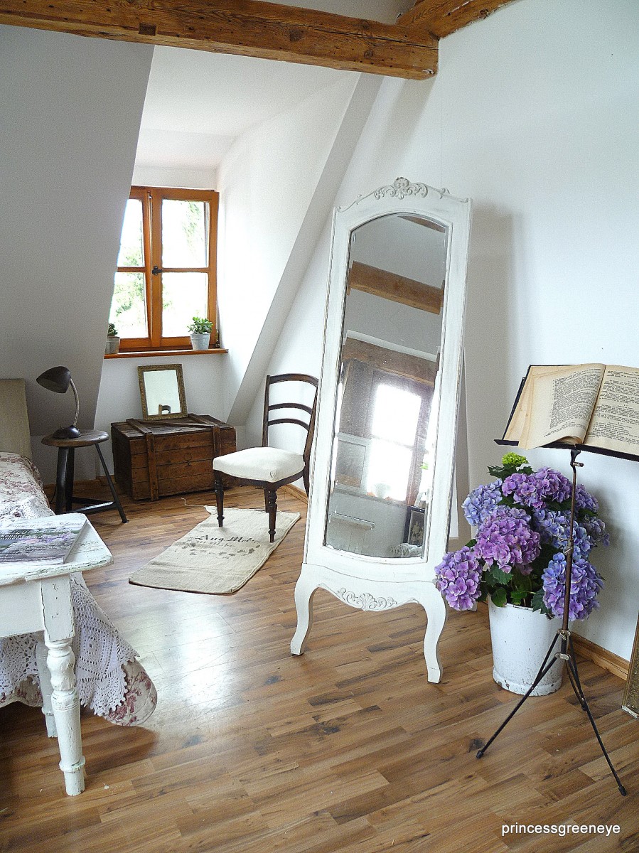 10.065Dieser Raum ist die "2.Hälfte" unseres Dachgeschosses. Bis vor kurzem hat unsere Tochter diesen Raum bewohnt. Nun wurde er komplett neu gestrichen - in warmem Grau und Weiss - und soll nun einerseits ein Gästezimmer sein und wird andererseits als weitere Staufläche für die Teile genutzt, die noch nicht endgültig fertig sind, noch darauf warten in unsere Shops oder unseren Laden zu wandern.