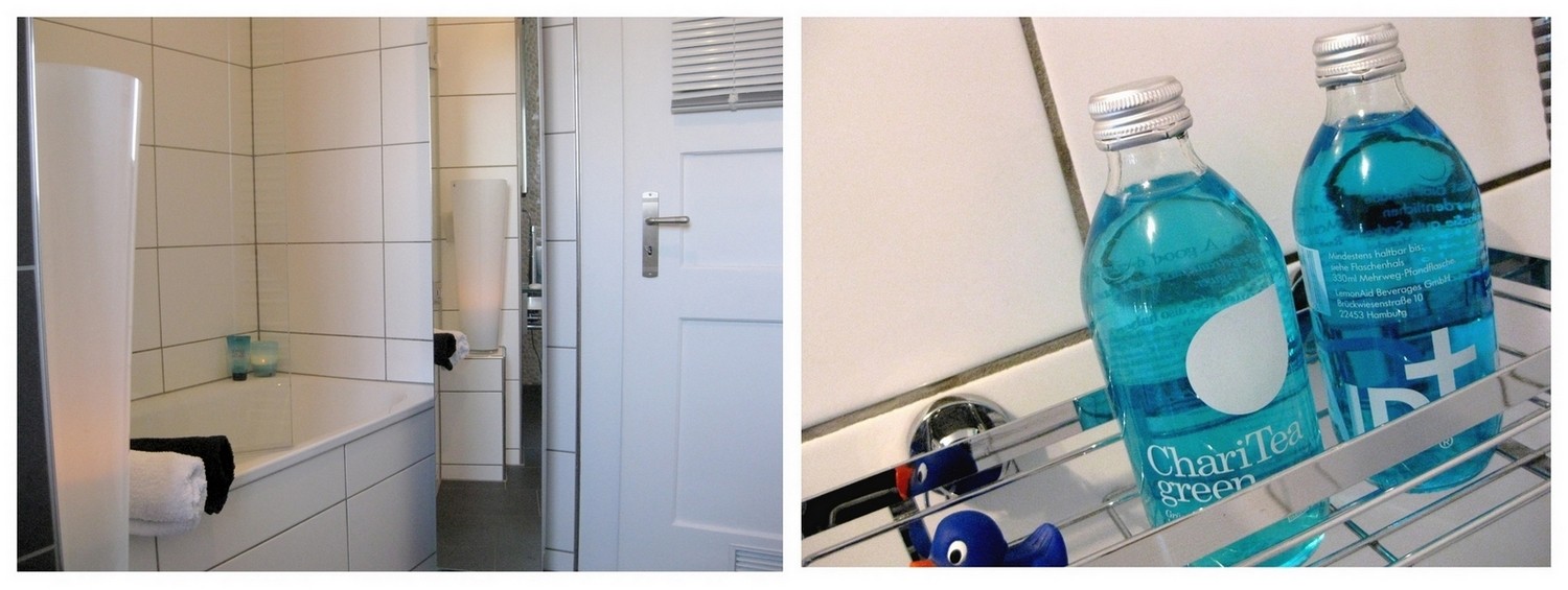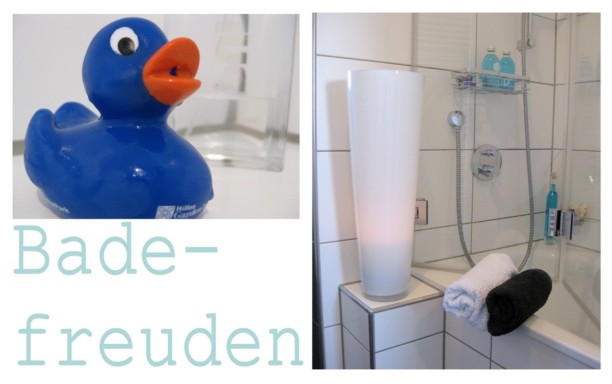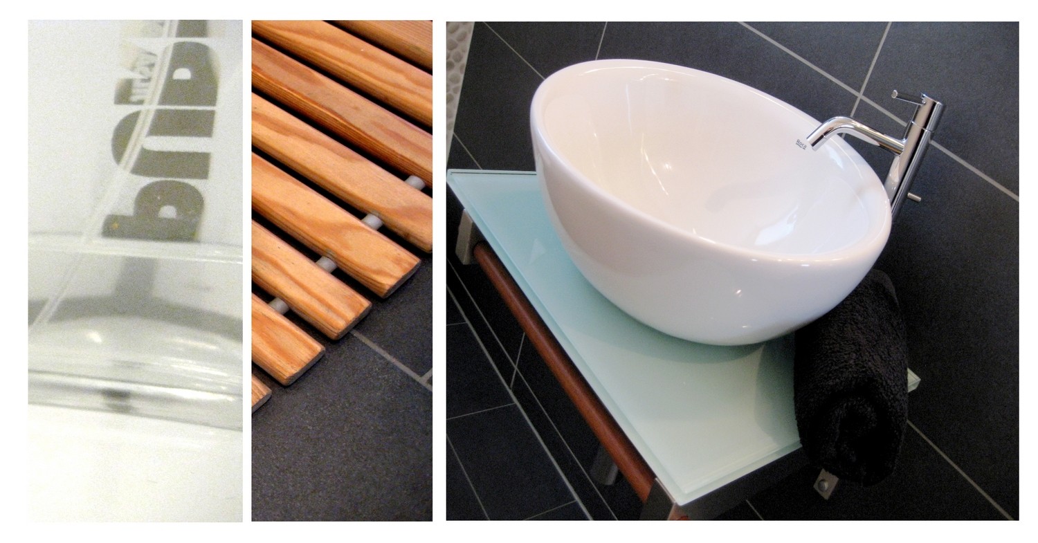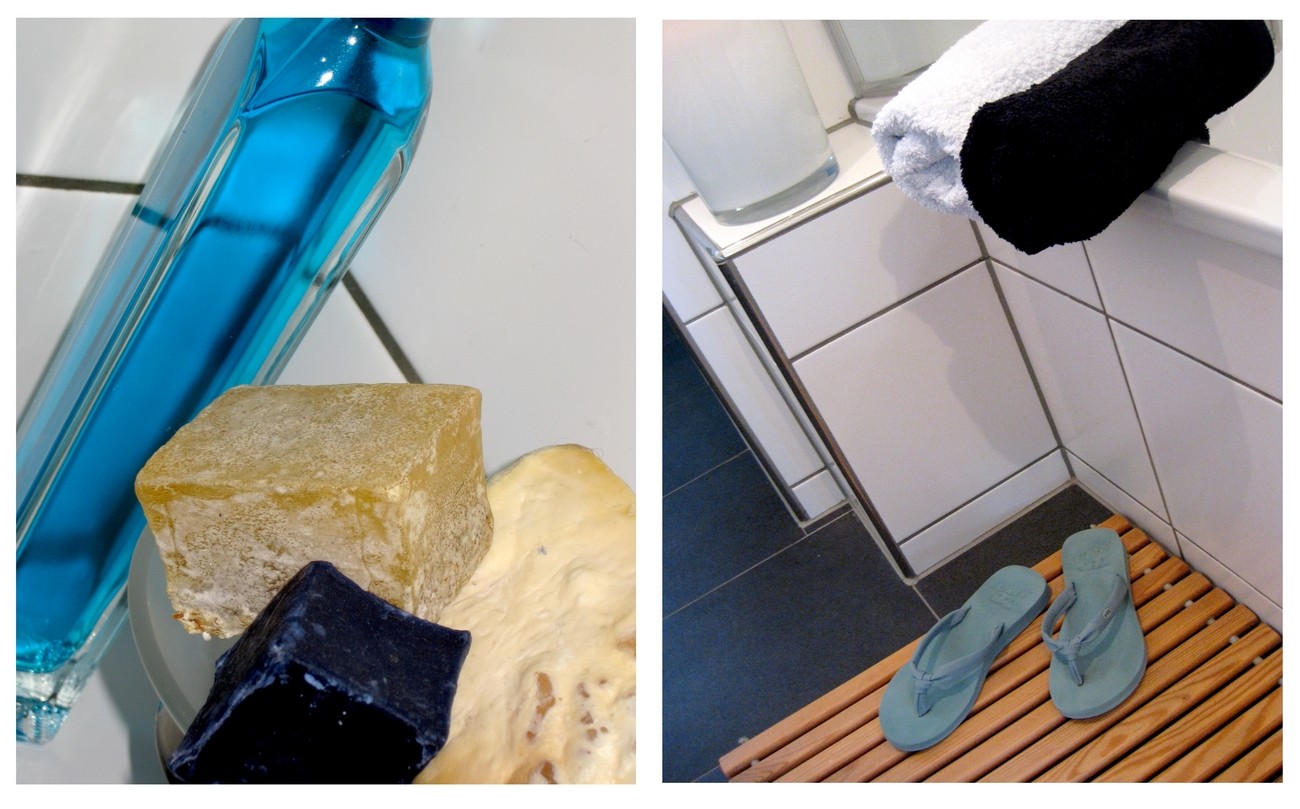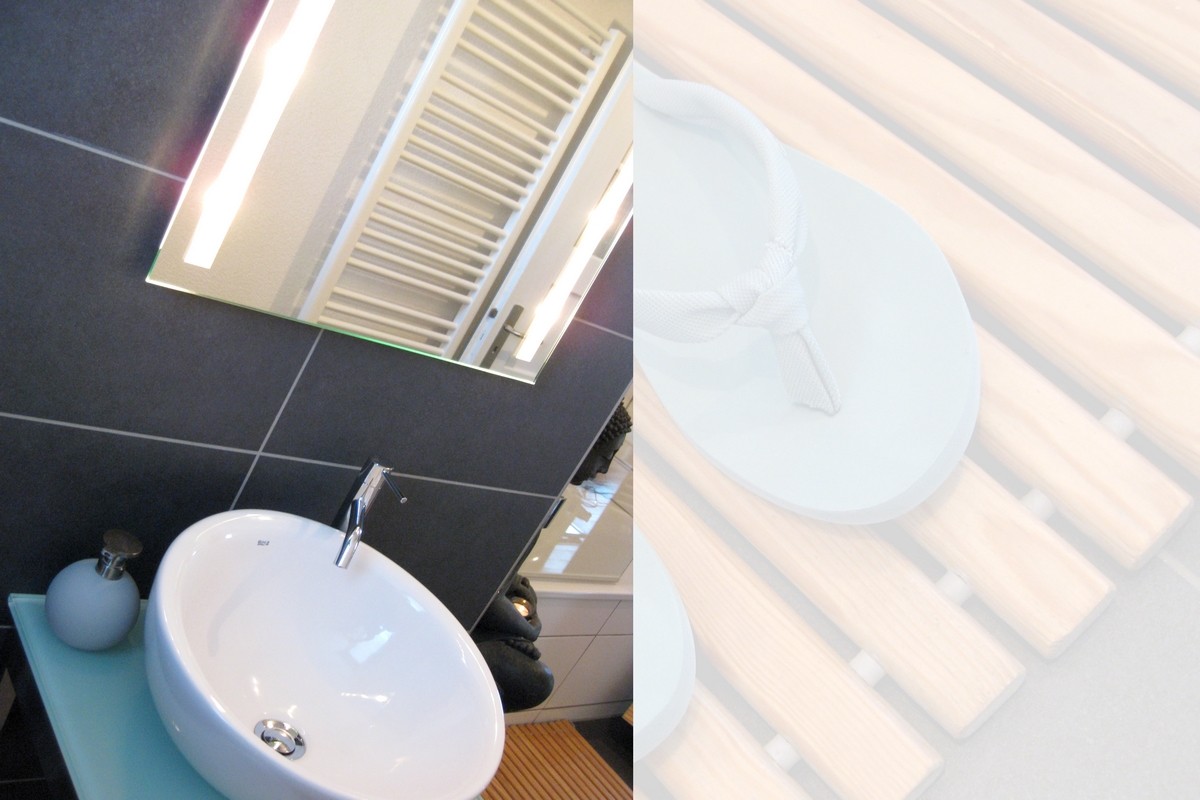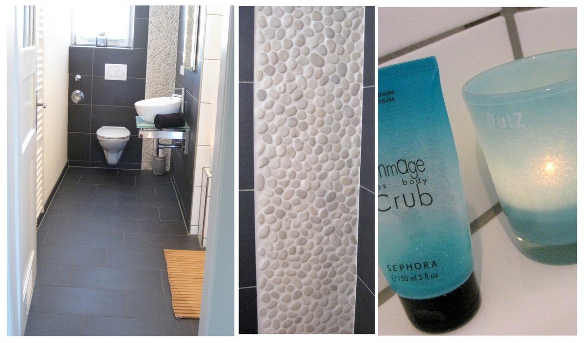 Ein bisschen Holz, ein paar Kieselsteine, cooles Glas, die Kombination schwarz+weiss, dazu ein Klecks türkis... Alles andere wäre zu viel für unser XS-Bad.