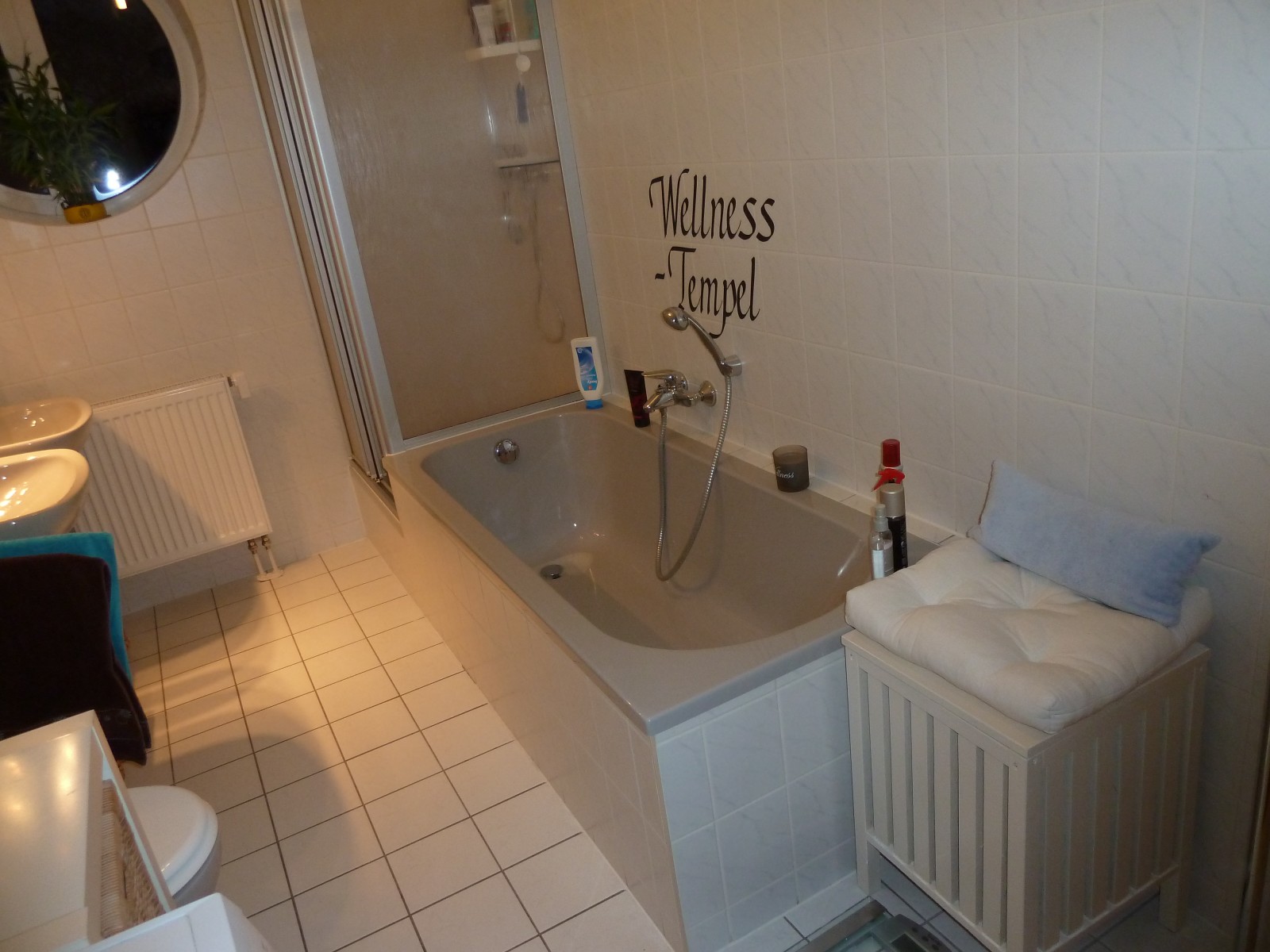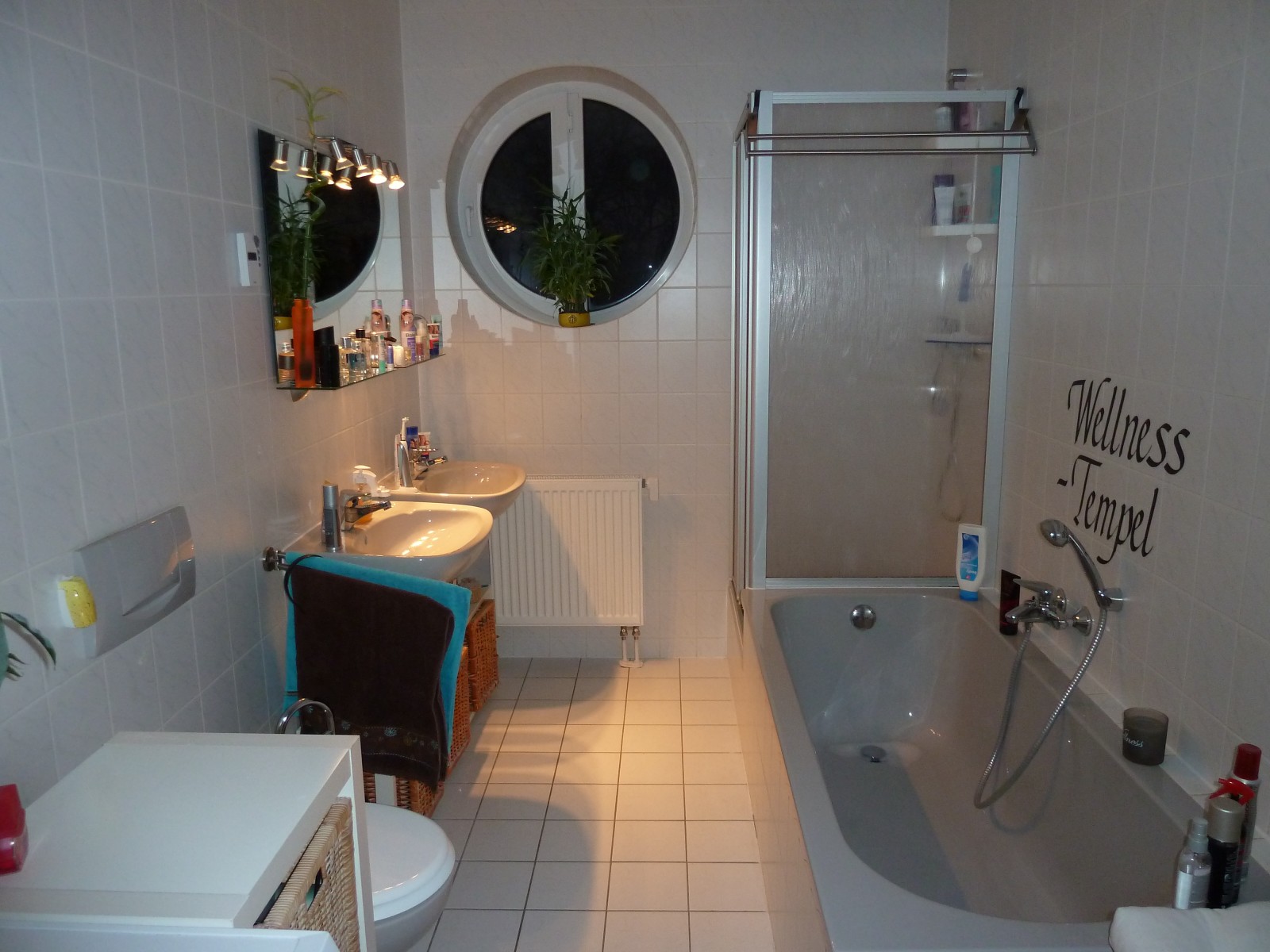 Unser Bad ist eigentlich nicht so toll..ich stelle es halt trotzdem mal mit rein, damit ihr euch ein Gesamtbild machen könnt. Finde weiße Fliesen (vorallem für den Boden) ganz schrecklich..aber kann man sich als Mieter halt nicht aussuchen..
