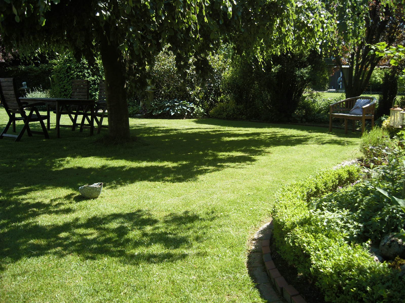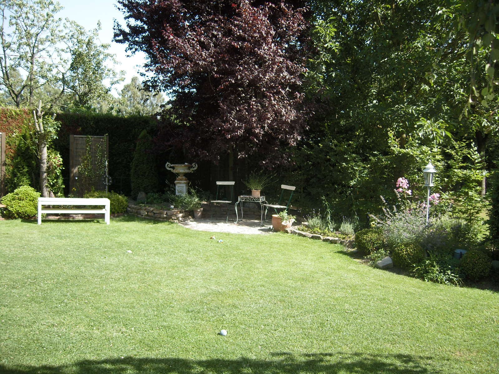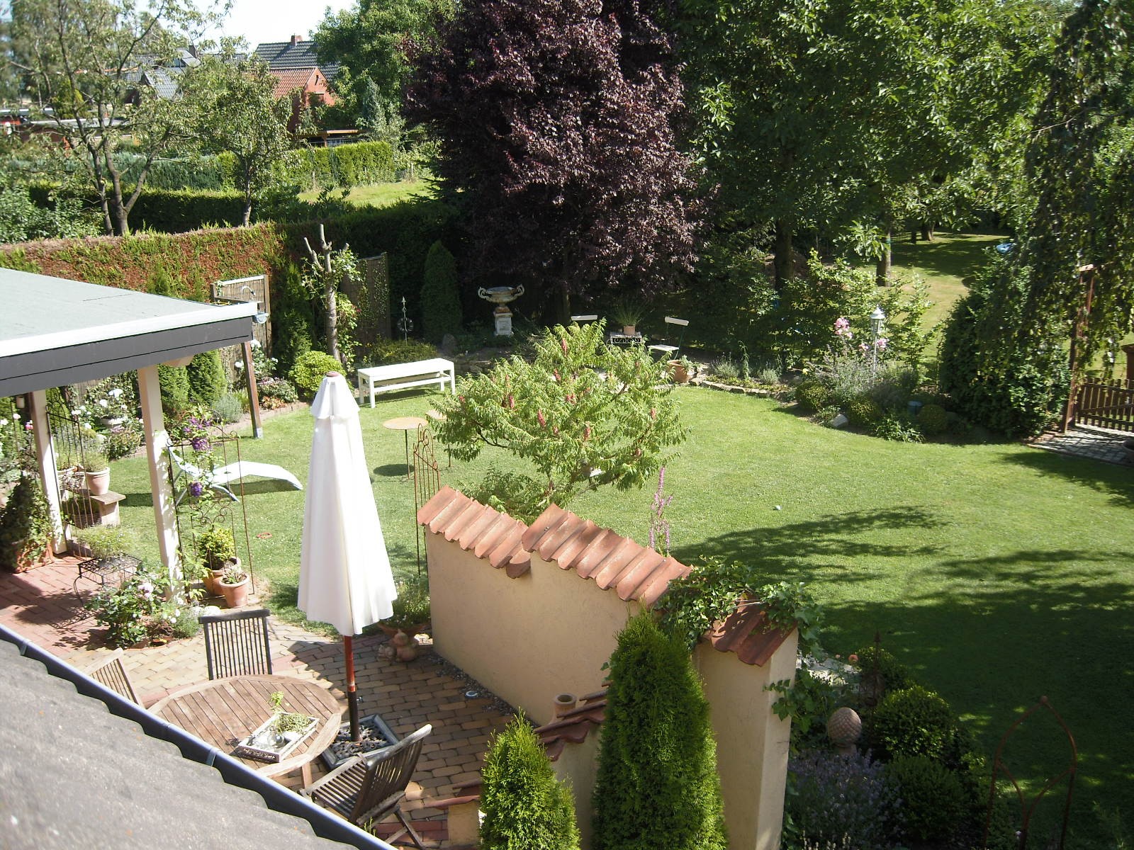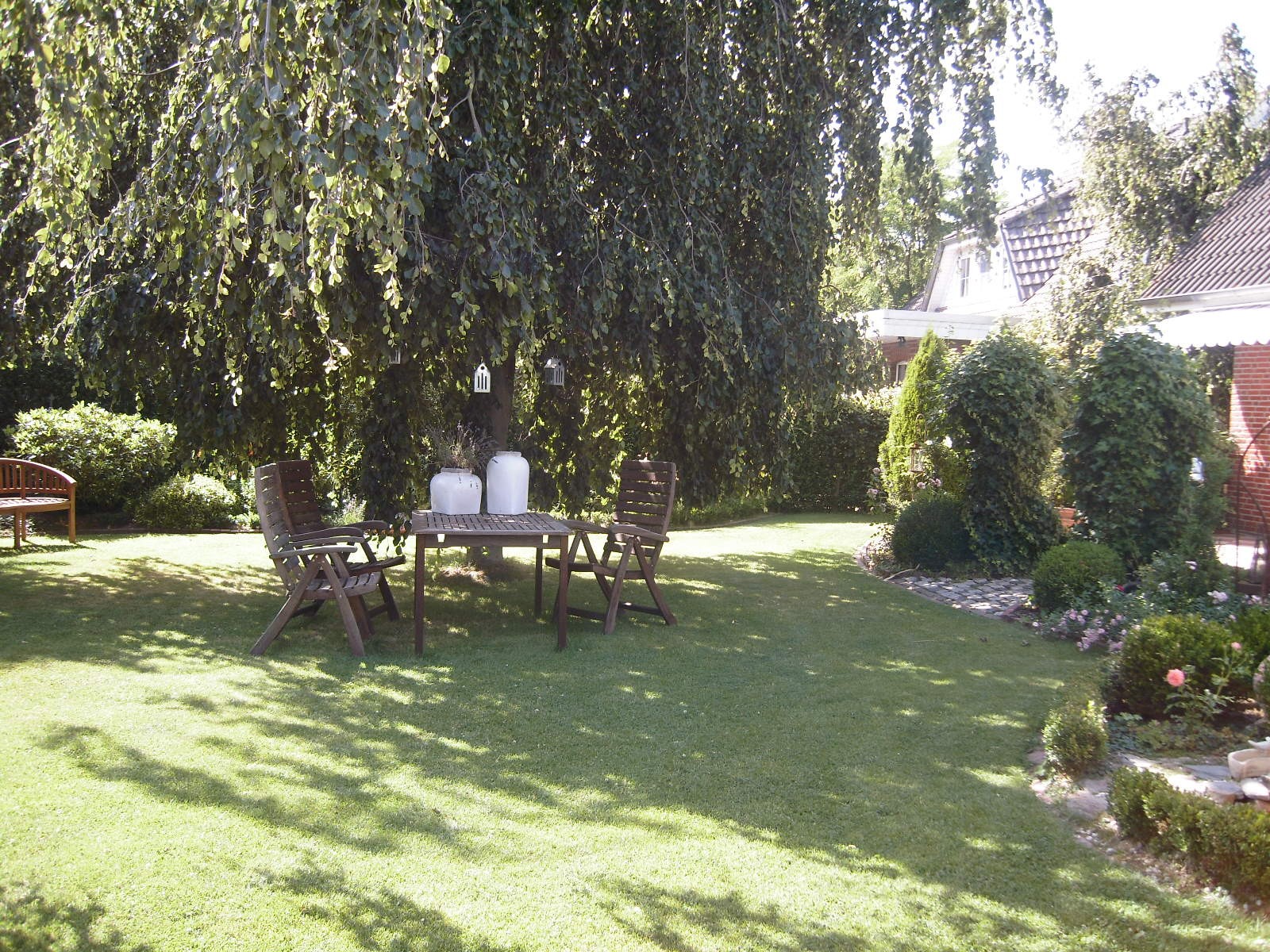 Aus der Vogelperspektive.Unter der grossen Hängebuche lässt es sich im Sommer, wenn es heiss ist, sehr gut aushalten.