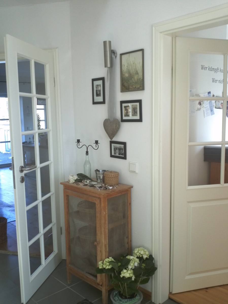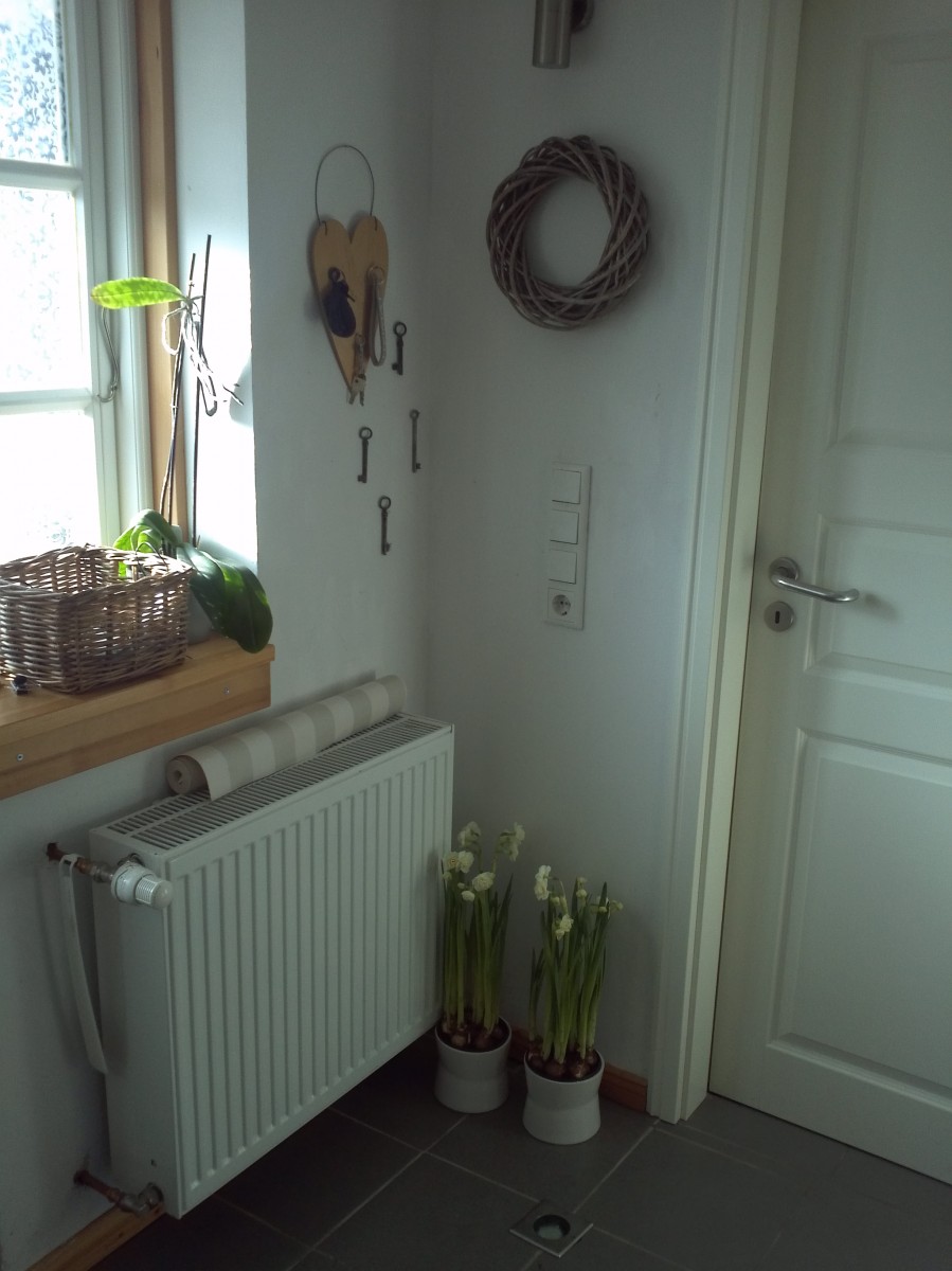 Wie erwähnt ist unser Häuschen noch nicht ganz fertig- den Flur mit eingeschlossen. Auf dem einen Foto seht Ihr eine Tapete auf der Heizung. Die wollte ich auf halbe Höhe tapezieren und darüber mit der dunkleren Farbe aus der Tapete weitermachen. Was meint Ihr?