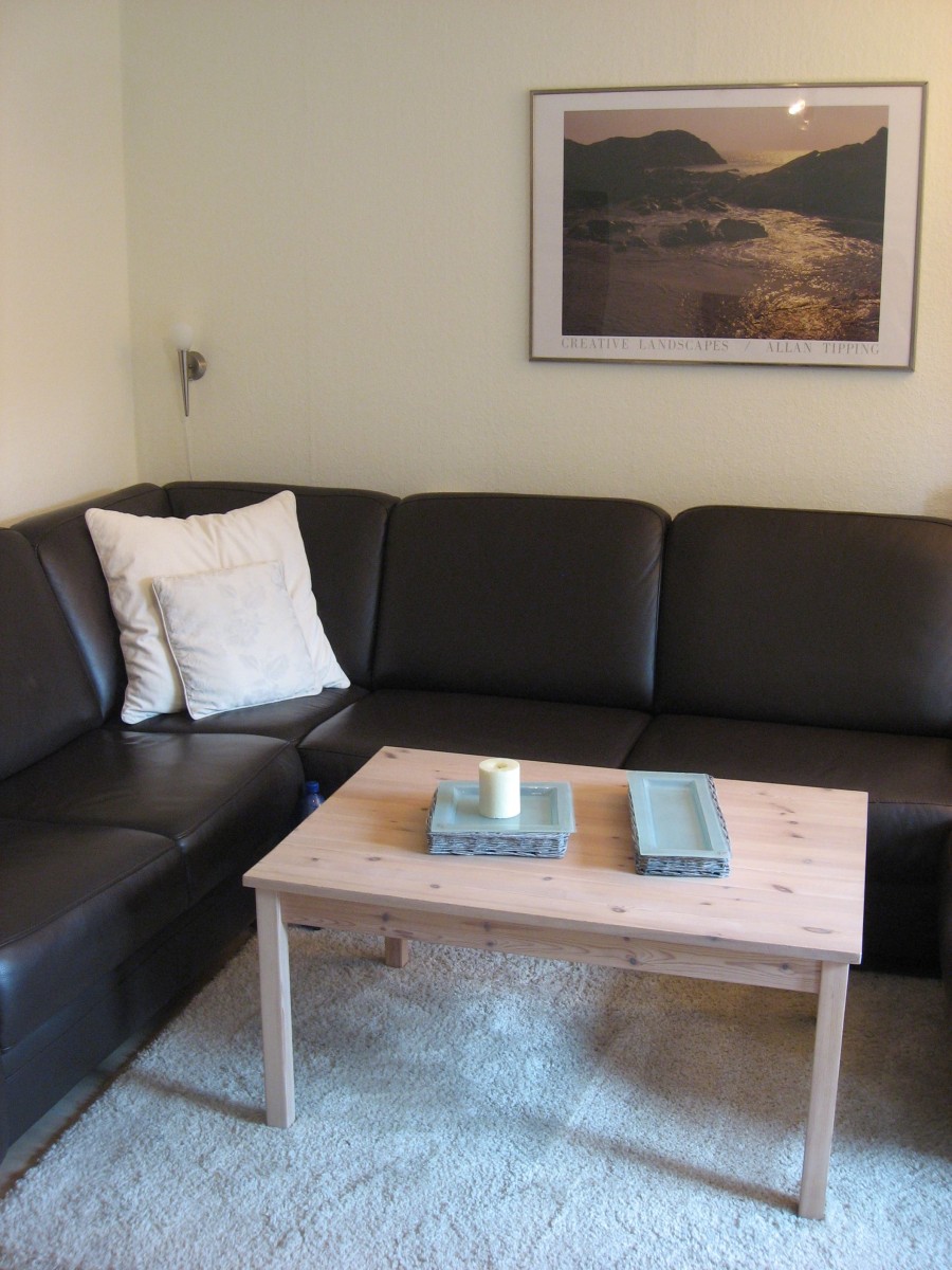 Unsere Couch mit gewachstem Tisch. Die Bilder links ist meine Ahnengalerie. Da hab ich alle alten schwarz/weiß Fotos von früher aufgehängt.