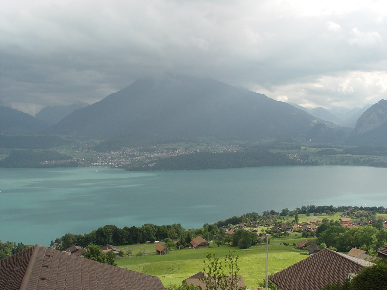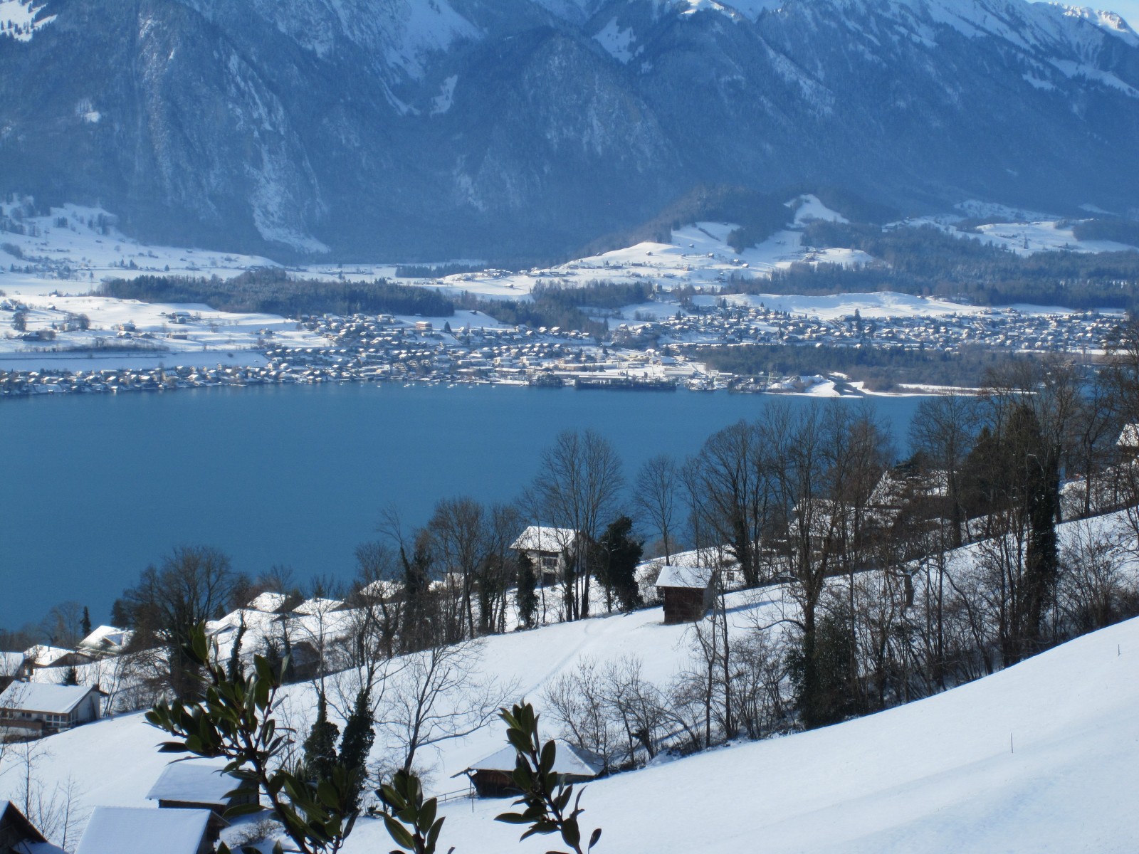 Wir wohnen in einem wunderbaren Holzchalet im Berner Oberland (Schweiz). Dort wo andere Ferien machen, sind wir Zuhause. Unsere Aussicht über den Thunersee ist nicht zu überbieten!