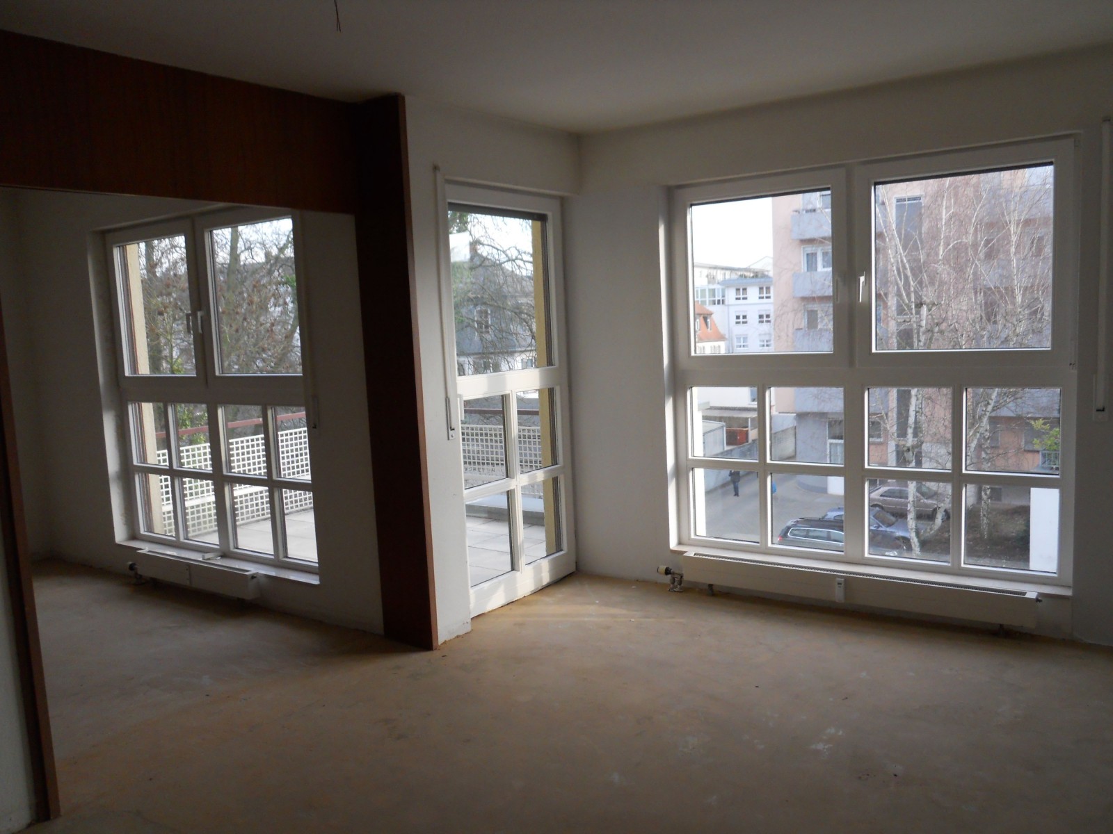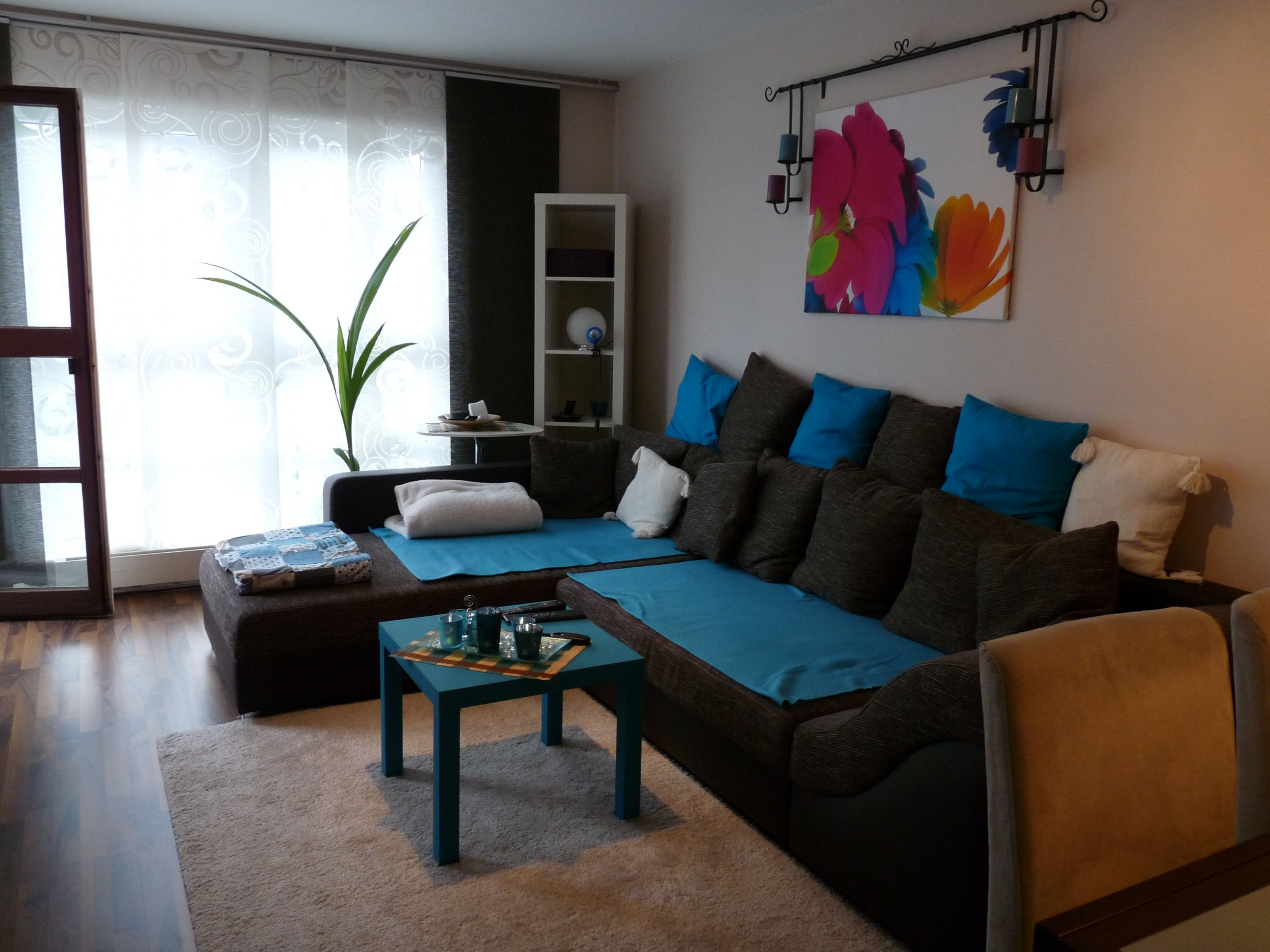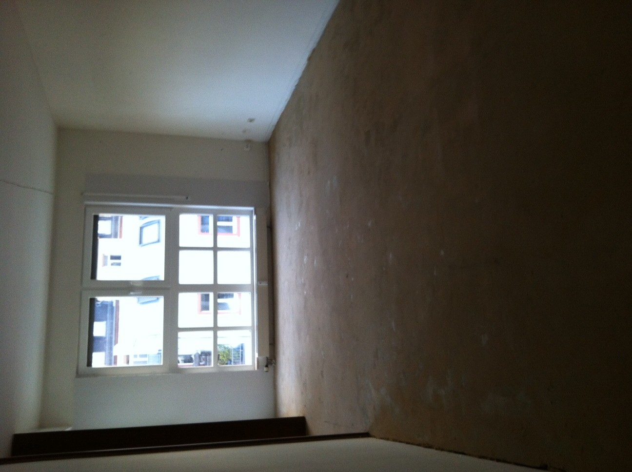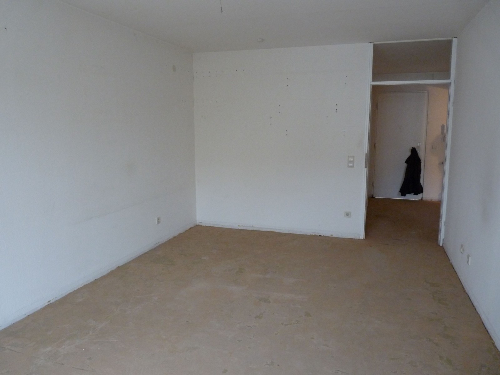 Am Ende des Raums, kurz vor der Balkontür ist eine große, alte Schiebetür, die das Wohnzimmer mit dem Schlafzimmer verbindet. Das Schlafzimmer hat aber auch noch eine eigene Tür.