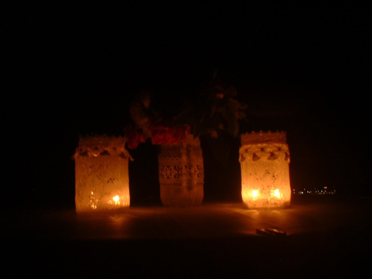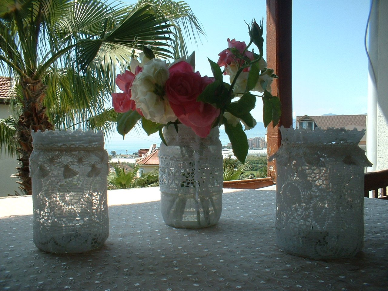3 alte Gurkenglaeser habe ich mit alter Gardine und etwas Spitze beklebt - dienen jetzt als Vase und Windlicht