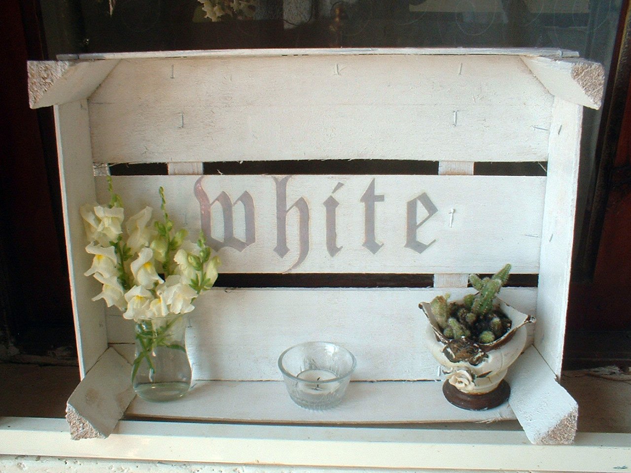 eine Mandarinenkiste weiss lackiert und, aus Ermangelung einer Schablone zum Nachzeichnen, mit Buchstaben beklebt