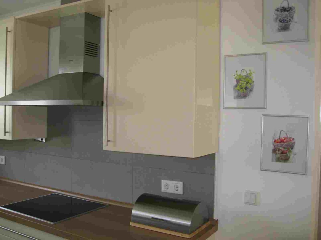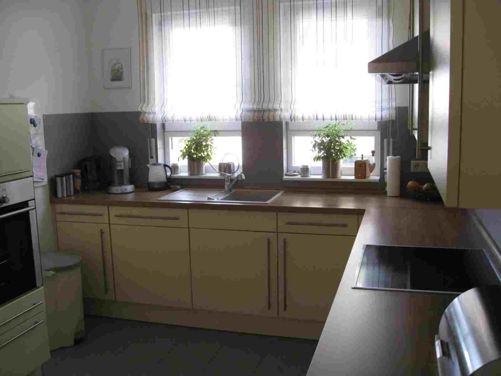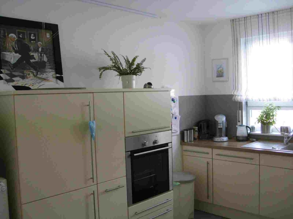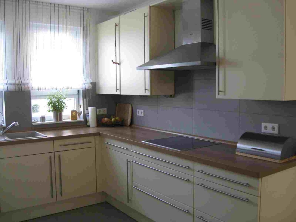 Unsere Küche ist in vanillefarben und hat eine noccefarbene Arbeitsplatte. Sie ist zwar klein, aber zweckdienlich und überschaubar.