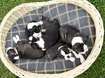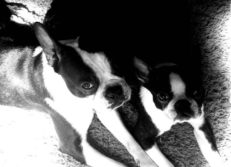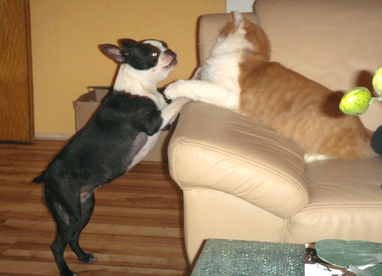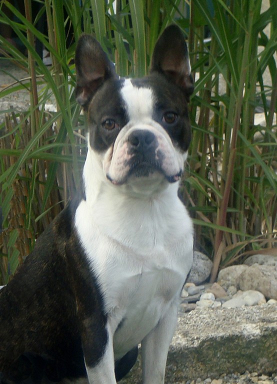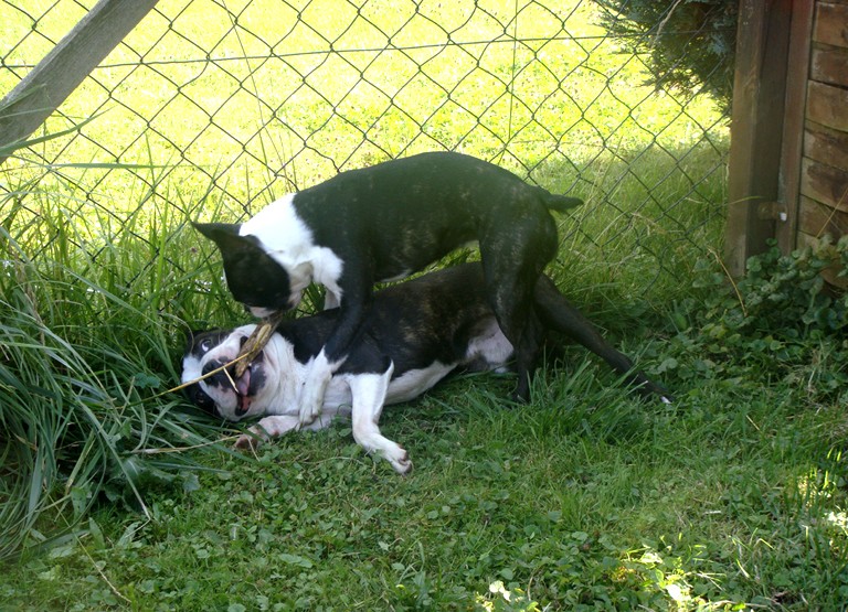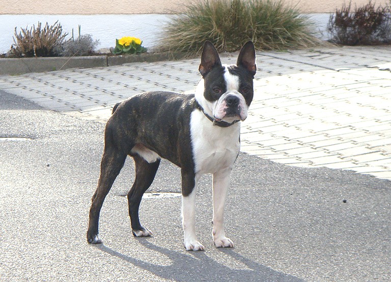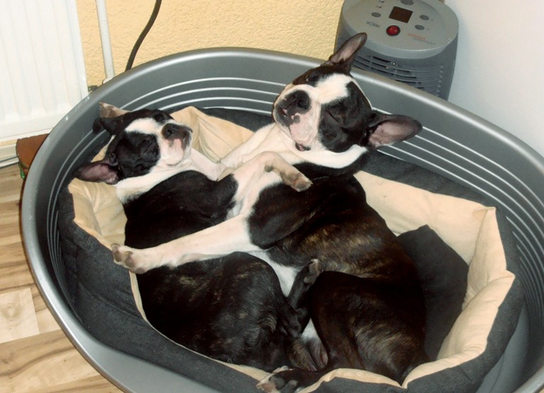 Hier sind unsere Haustiere zu sehen. Dazu gehören 3 Boston Terrier, mit denen wir auch eine kleine Liebhaberzucht betreiben, sowie unsere Katze und Schildkröte.