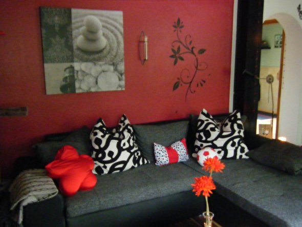 Wohnzimmer in Schwarz und Weiss mit Rot