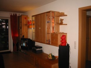 Die Wand ist aufgrund der Heizung nur schwer zu nutzen gewesen. Die Vitrine hat einen weißen Korpus und drei Türen in Buche. Ein drehbarer Fernsehtisch ist schwer zu finden, zumindest einer, der mir zusagt.