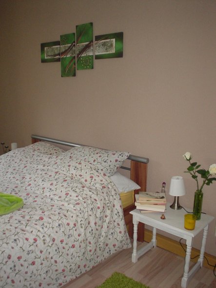 Unser neu gestaltetes Schlafzimmer. Fußboden mit meinem Mann selbst verlegt. Die braun-beige Wandfarbe war meine Idee und ich finde es passt gut zusammen.