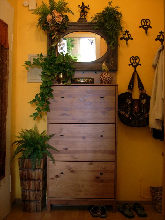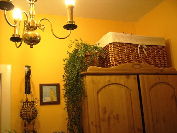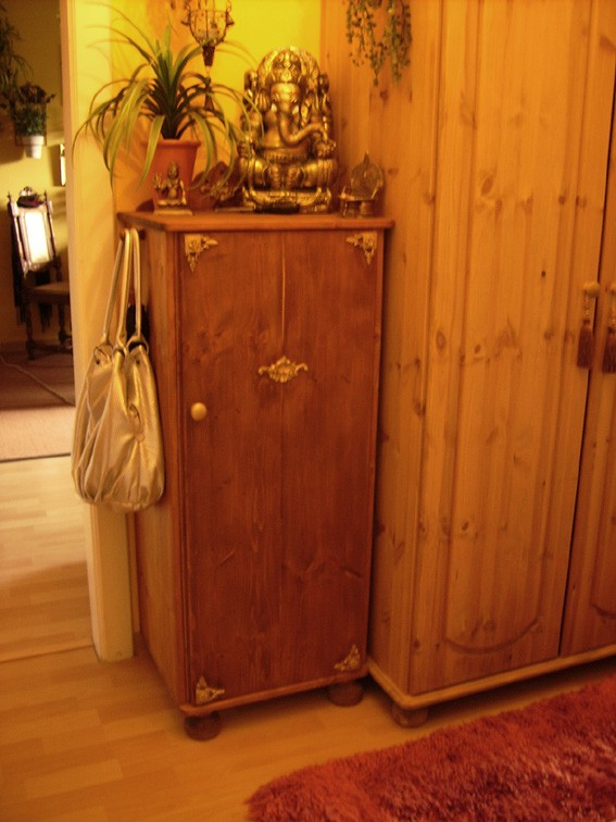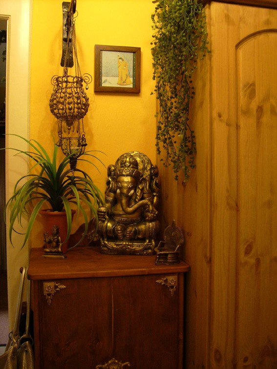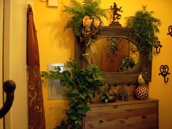 Über einem schmalen aber dafür etwas höheren Schuhschrank hängt ein auf Antik gemachter Spiegel. Leider verschandeln hier der Sicherungskasten und die Klingel die Wand etwas... aber ich hoffe, meine Deko lenkt ein wenig davon ab ;.) Leider hat der Flur kein Fenster, weshalb ich hier nur künstliche Pflanzen verwenden kann. Aber das sonnige Gelb machen alles heller und Tagsüber bekommt er von der Küche und vom Bad her auch immer etwas Licht ab.