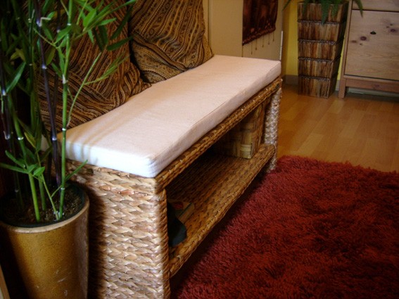 Ein etwas größerer Ausschnit der Sitzbank. An der Wand dahinter habe ich mit der Heißklebepistole ein preiswertes Baumbusrollo aus dem Baumarkt aufgeklebt. Sieht prima aus und macht die Ecke viel gemütlicher.