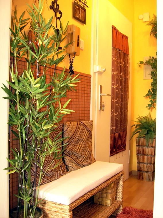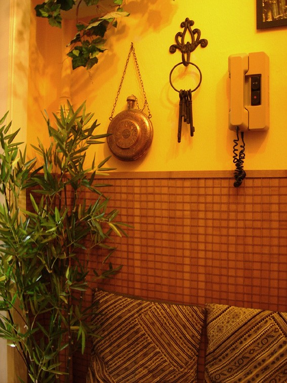 Hier noch eine bessere Ansicht des als Wandverkleidung umfunktionierten Baumbusrollos. Die Gegensprechanlage ist doch der Hammer an Häßlichkeit, oder? Am liebsten würde ich die auch irgendwie zudekorieren...