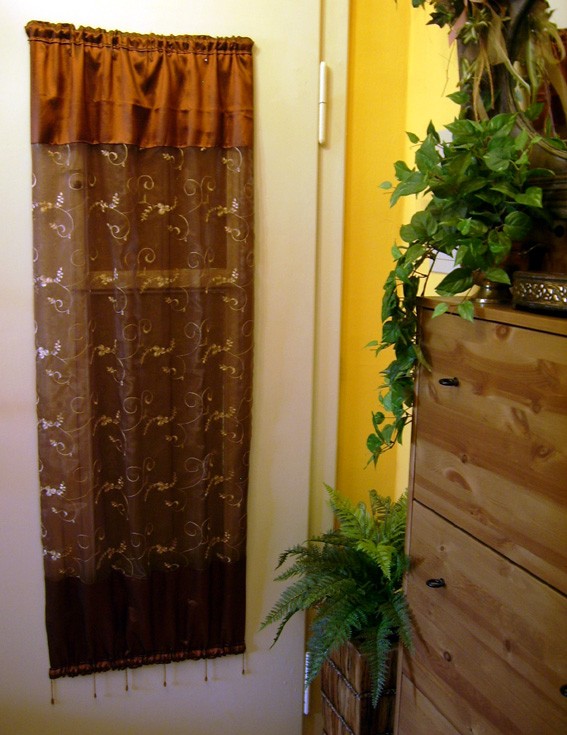 (Blick von der Küche aus)Die Wohnungstür ist ziemlich altmodisch - eigentlich ganz süß. Sie hat sogar eine Art Fensterchen mit Riegel zum rausgucken... wer draußen steht :-) Aber das Fenster darin ist aus weißem Glas, zwar gemustert, aber es hat mich gestört. Deshalb habe ich die Scheibe mit einer goldfarbigen Klebefolie beklebt und der 'Vohang' besteht aus einem Tischläufer. Einfach oben und unten einen Saum nähen und auf Scheibengardinen aufziehen.