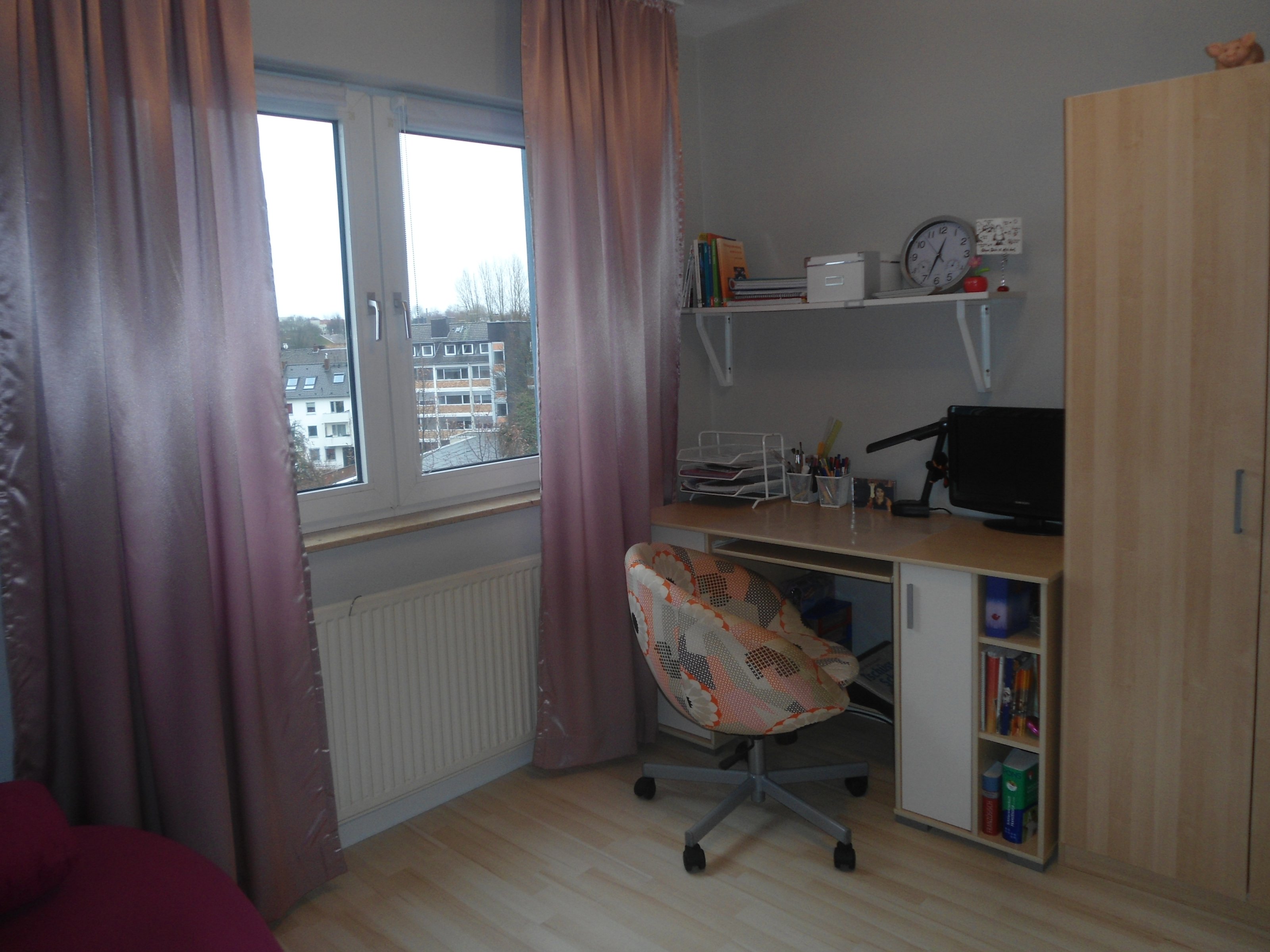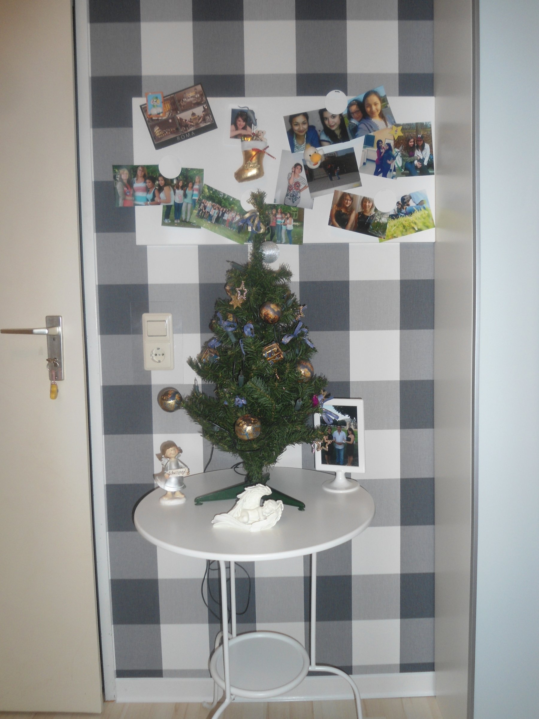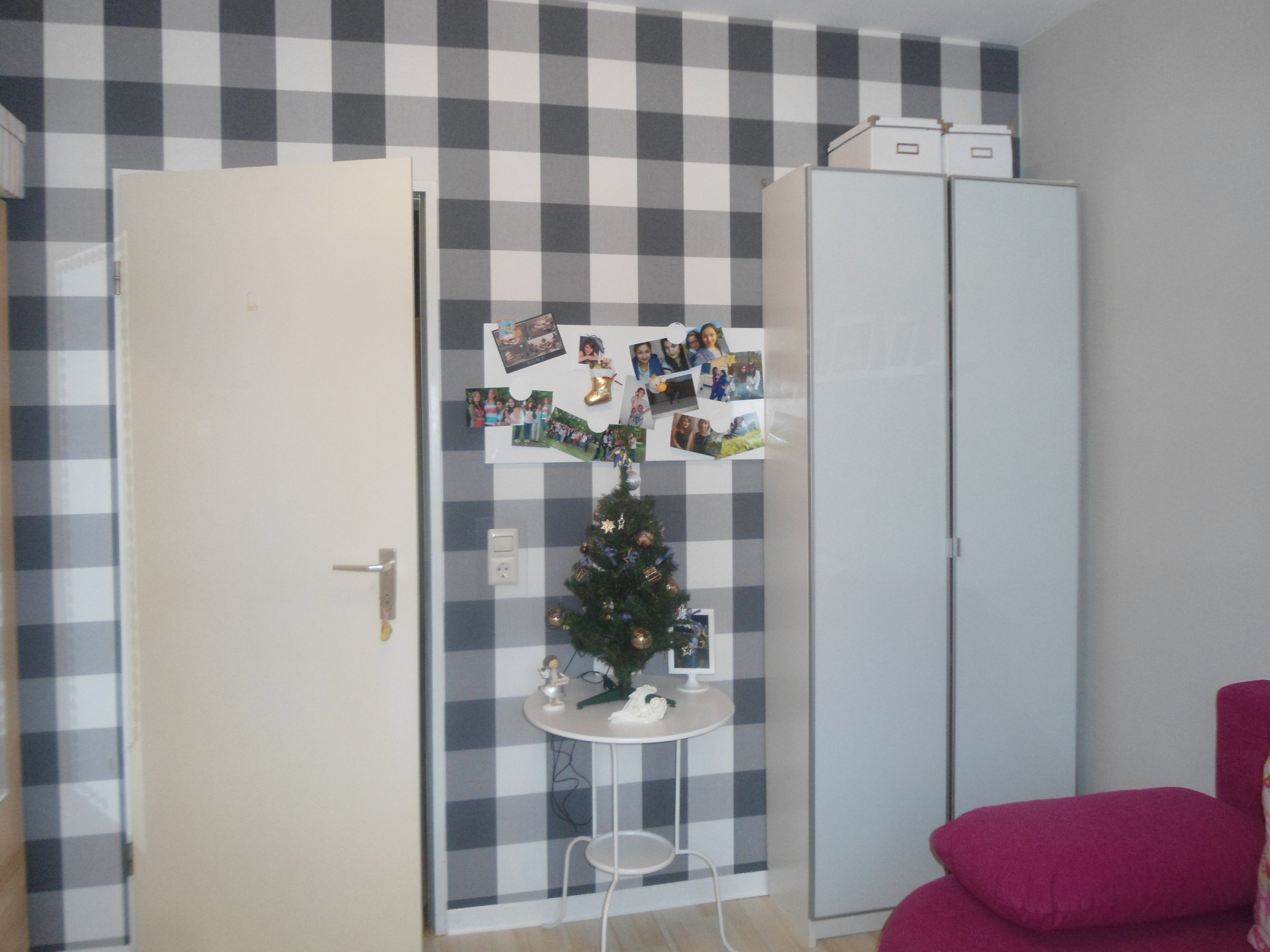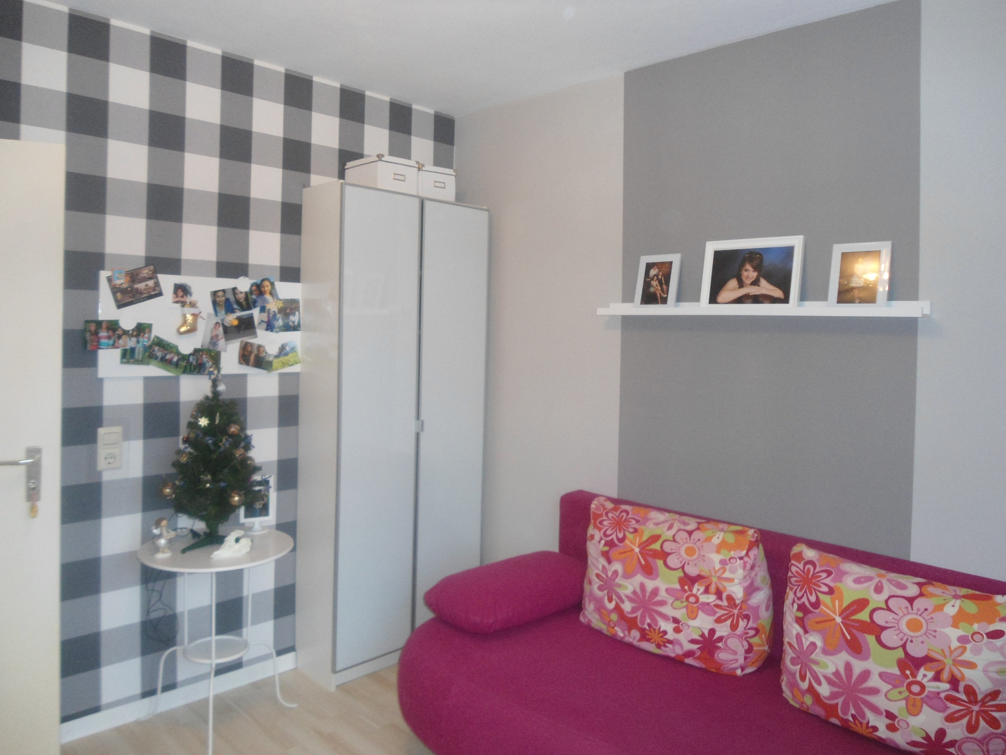 10.328Das Zimmer meiner 17-Jährigen Tochter. Sie hat diesmal graue Töne für die Wände gewählt. Eine Wand mit karierten Tapeten von Rasch sollte hier Hinqucker sein.