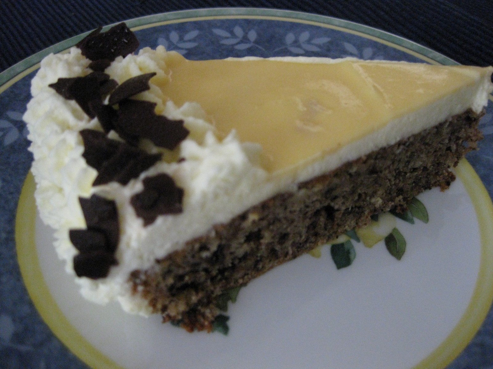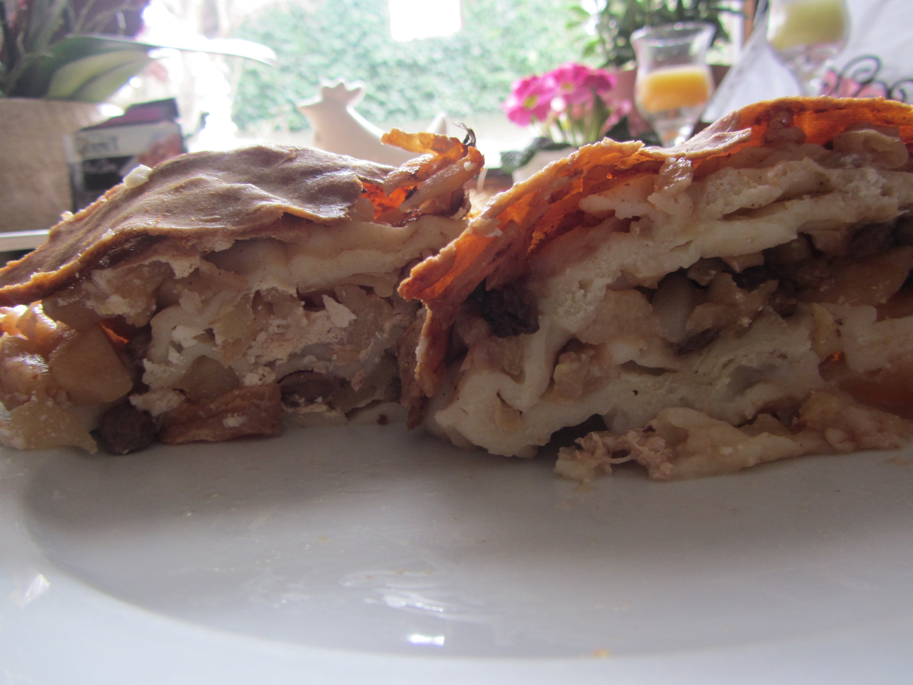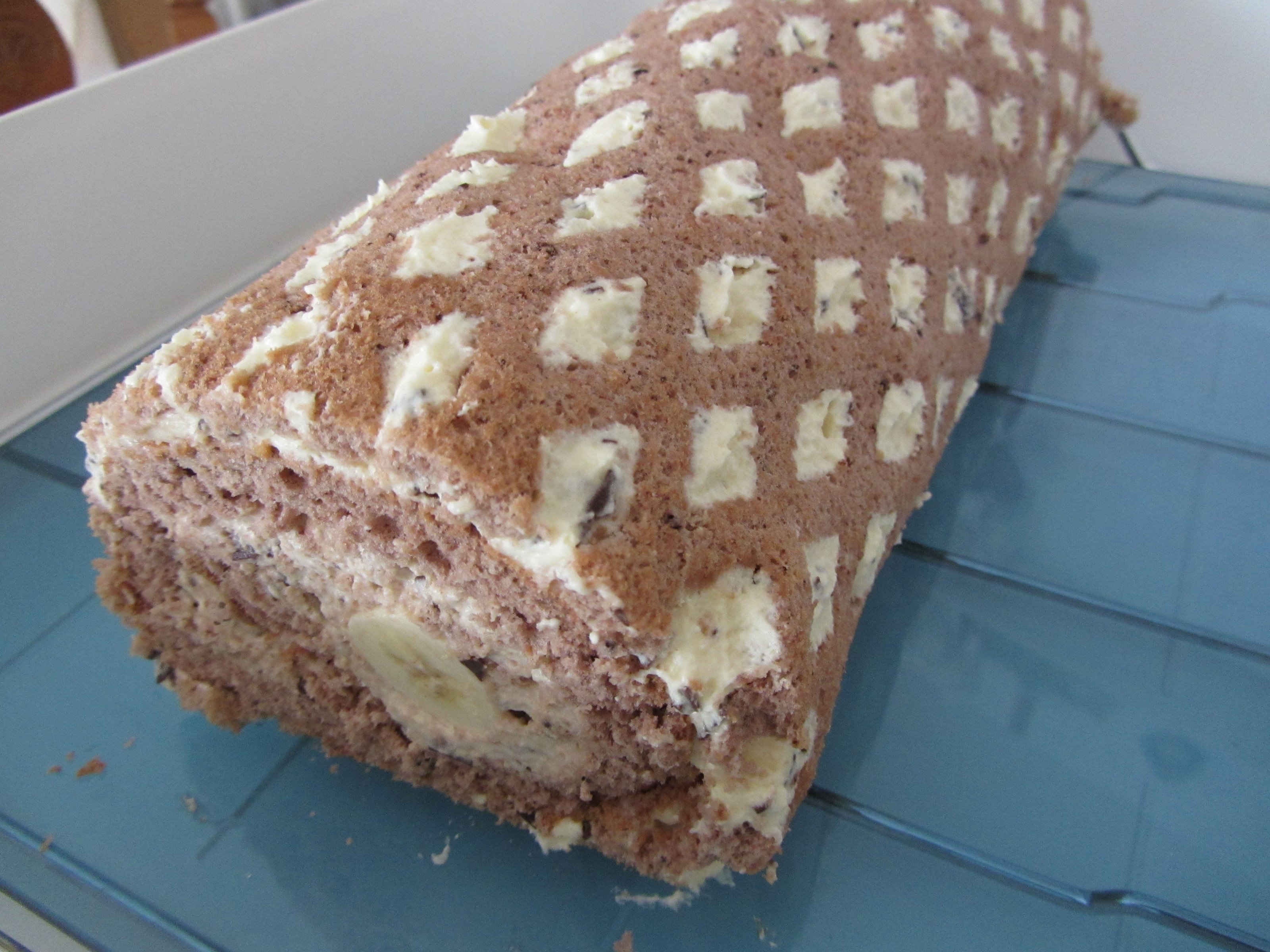 Die Füllung besteht aus Sahne mit Vanillepuddingpulver, Eierlikör, Schokoraspeln und Bananenstücken
