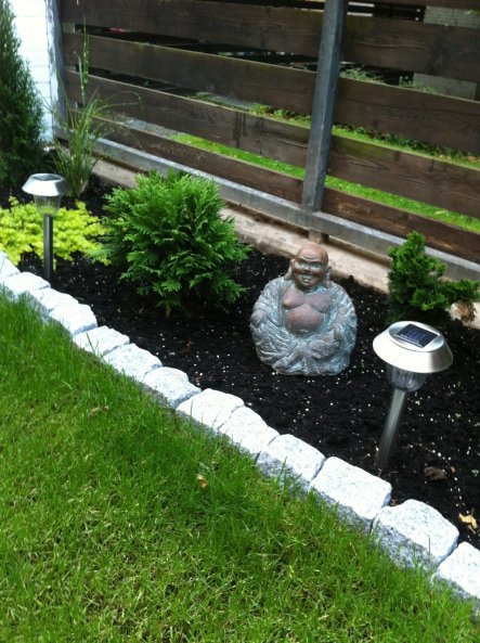 Der kleine Garten, der zur Wohnung gehört hat eine Rasenfläche von ca. 6qm. Wir haben rundherum Beete angelegt. Neben Blumen planze ich im Sommer immer auch Gemüse und Kräuter an.
