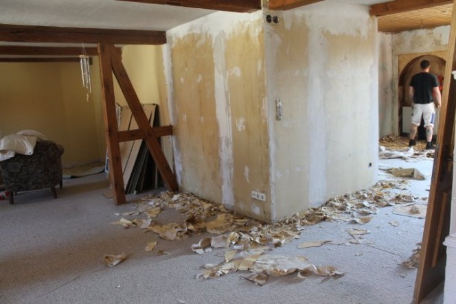 10.009Das Wohnzimmer mit Essecke und grosser Küche wird ca.65 qm gross werden. Wir haben auch hier den Stadthausflair erhalten und die alten Balken so dunkel wie den Boden lassiert. Die Decken im Wozi sind nur angeschliffen und grundiert so entstand ein florales Muster. Der grosse weiße Kachelofen macht uns hoffentlich im Winter eine behagliche Wärme , auch hier noch viel Arbeit die nächsten Wochen.