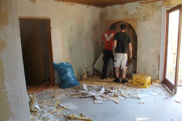 In dieser Ecke wird die neue Küche entstehen , das Fenster wird noch erneuert und die Türe links wird zugemacht, in dem Rundbogen wird später mal die Spüle integriert sein und der Bogen wird beleuchtet.