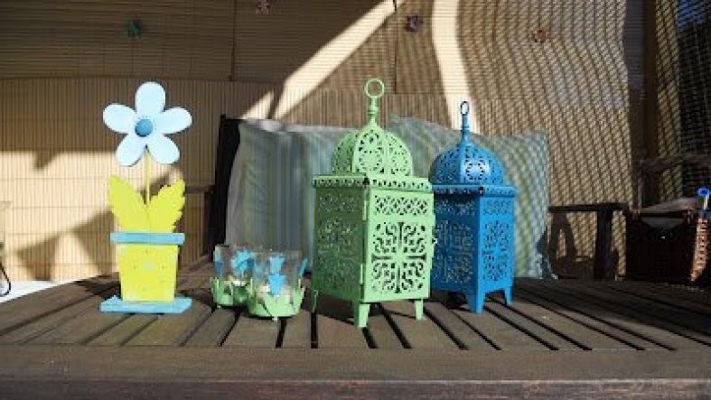 Die Deko (Kissen, Kerzen, Windlichter und laternen) in der Pergola habe ich in türkis-grün-weiss gehalten.