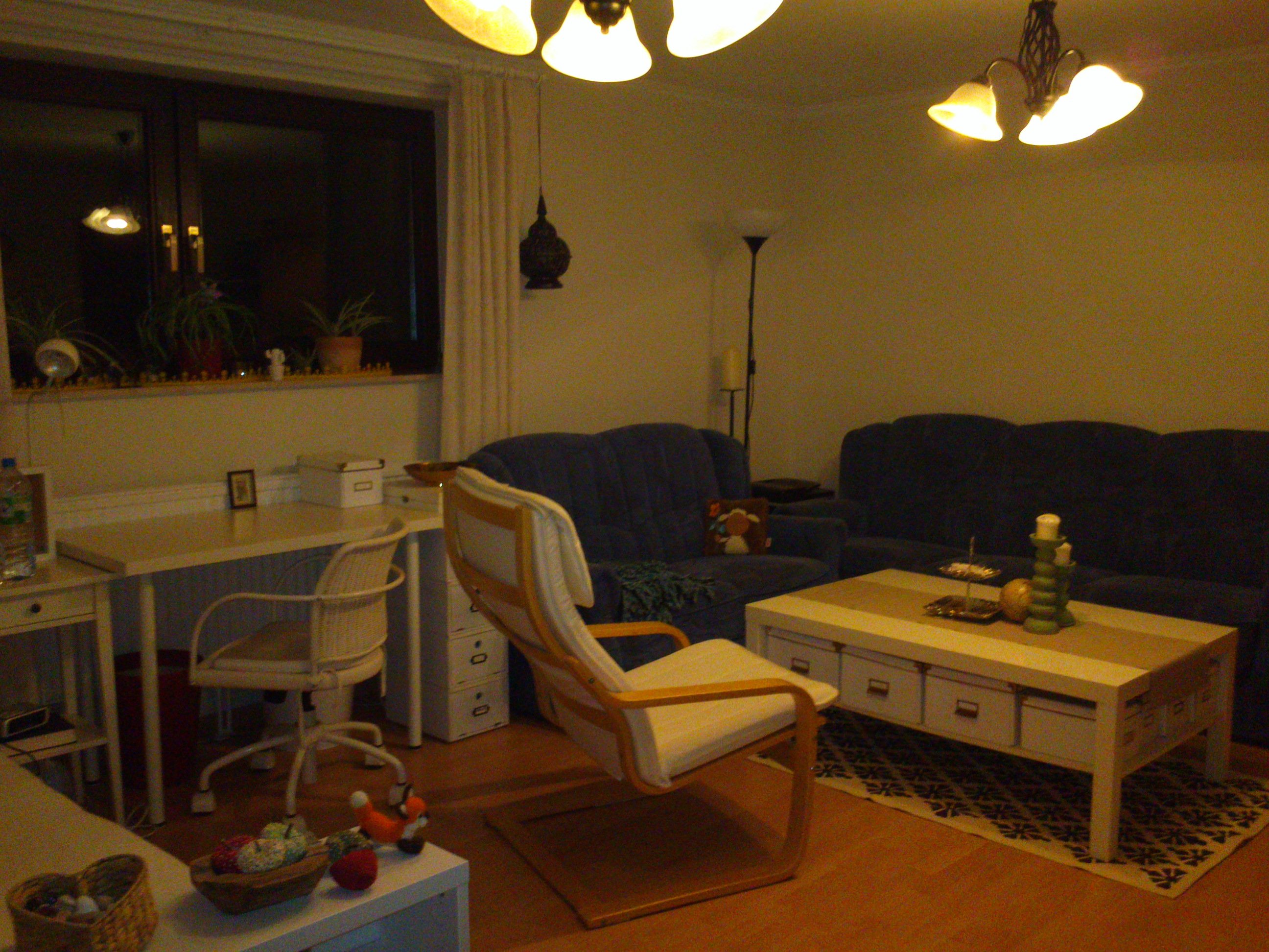 Mein Fenster, mein Schreibtisch und meine (nicht-so-sehr-geliebten) blau gemusterten Sofas.. Doch ganz gemütlich so weit :)