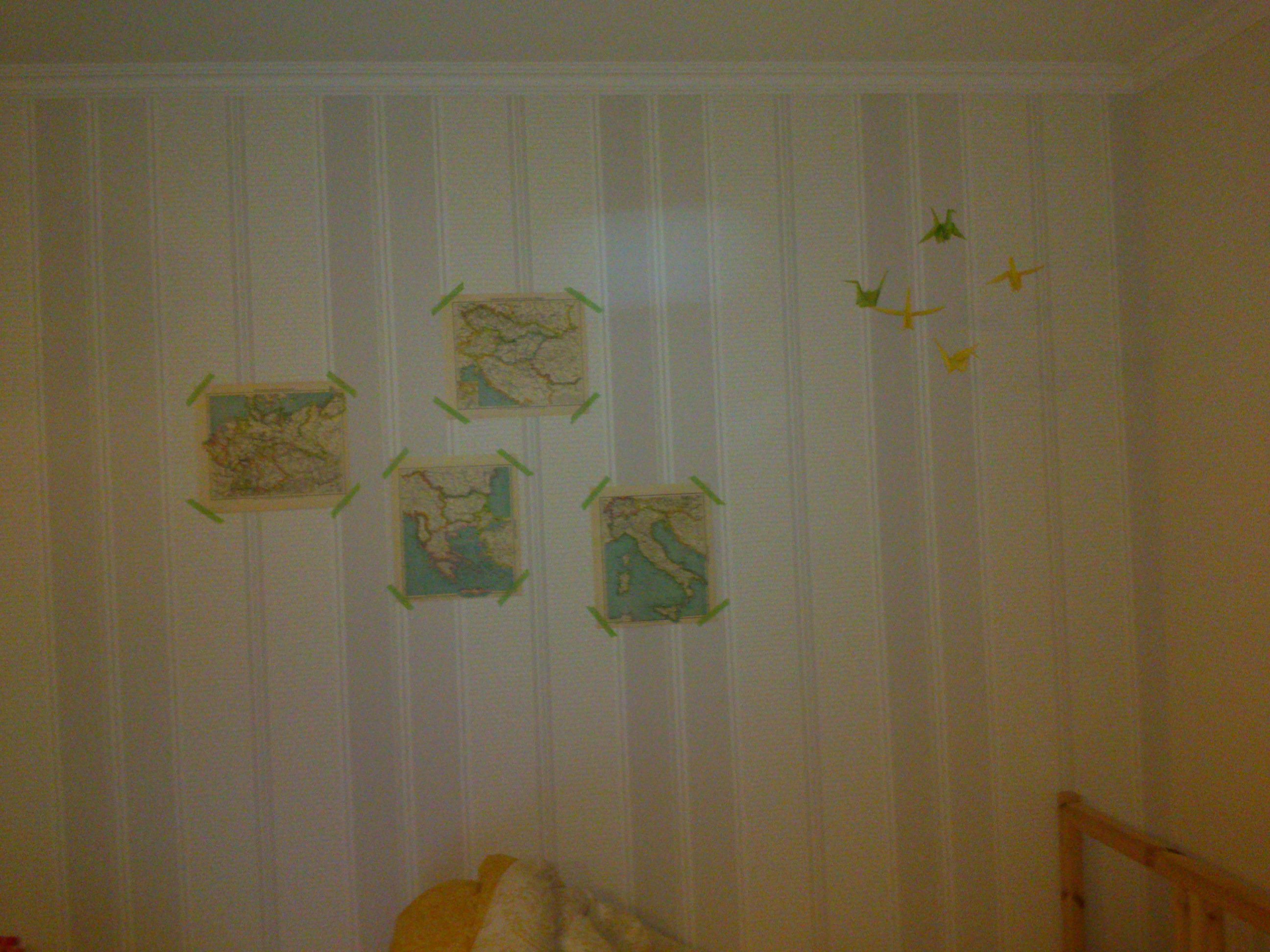 Hier die neue Deko meines Schlafbereiches - ein DIY Kranich "Mobile" und alte Europa-Karten aus den 50ern vom Flohmarkt