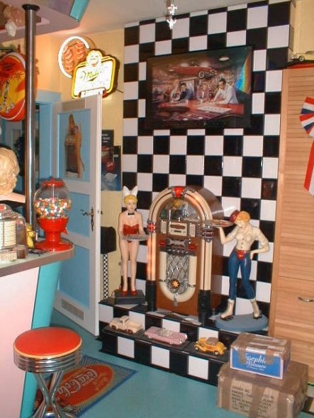 12.147Die Küche im Diner-Stil. Wenn schon, denn schon. Da wir bis letztes Jahr beruflich mit sowas zu tun gehabt haben, haben wir unsere Küche gleichzeitig als "Showroom" genutzt. Deshalb wurde halt etwas üppiger dekoriert... Das ein oder andere Teil wurde inzwischen verkauft oder umgestellt, aber im grossen und ganzen ist es so wie auf den Bildern....