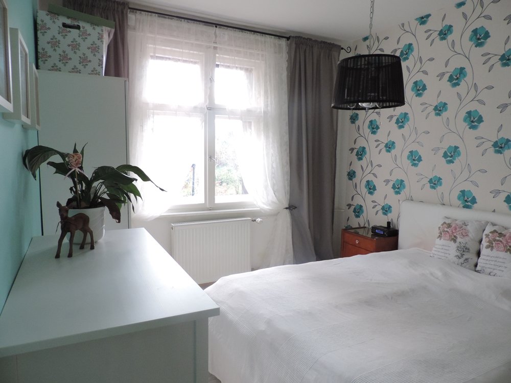 8.314Unser Schlafzimmer nach der renovierung. leider habe ich keine Foto´s gefunden wie es vorher aussah. Sollte ich noch eines finden werde ich euch diese sicherlich zeigen. Hinter meinem Nachtschrank war eine Tür zur Küche die wir geschlossen haben. Die Nachtschränkchen habe ich von meiner Oma geerbt, als sie ins Altersheim zog. Damit verbinde ich ganz viele Kindheitserinnerungen. Eines muss ich noch streichen.. Die Wände sind verputzt und ganz hell türkis gestrichen und tapeziert. Ichmag den Mix aus ein wenig Landhaus, Shabby und modernen Dingen.