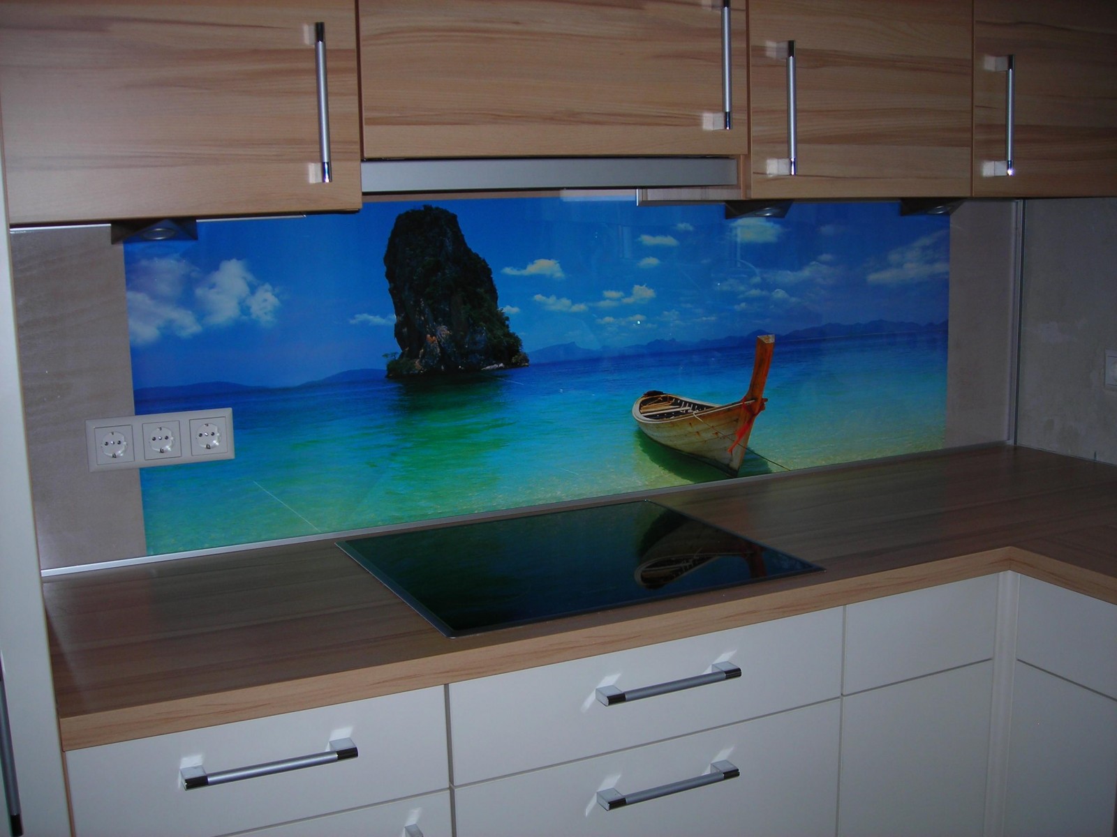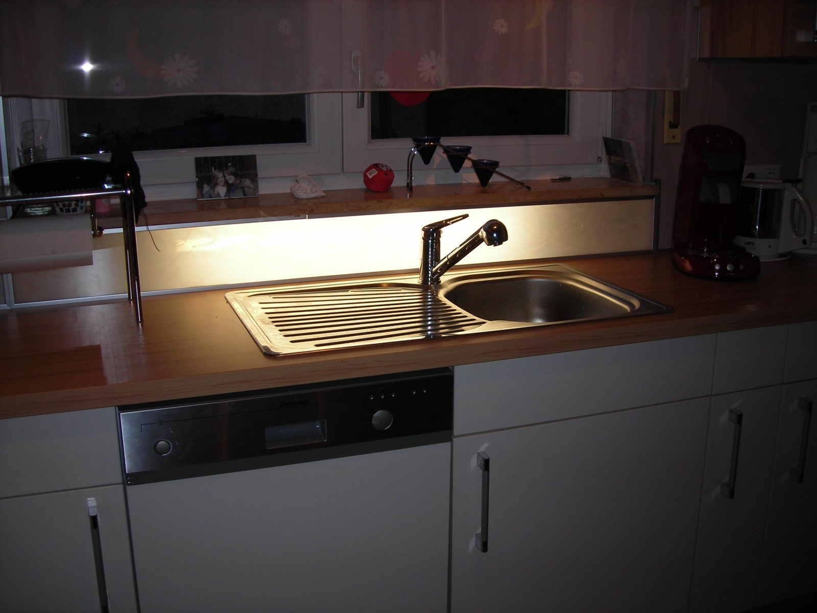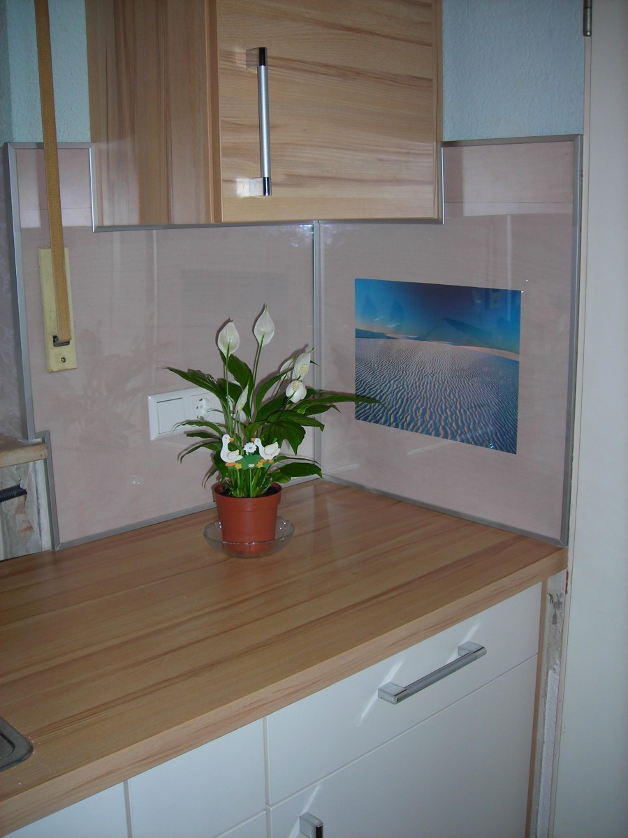 Für die Umrandung verwendeten wir Alu-Profile und das ganze ist nur zwischen den Ober-, Unterschränken und Wänden eingeklemmt und somit bei Bedarf austauschbar.